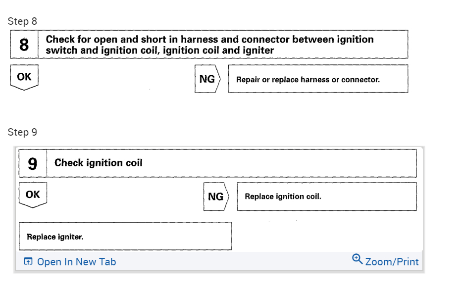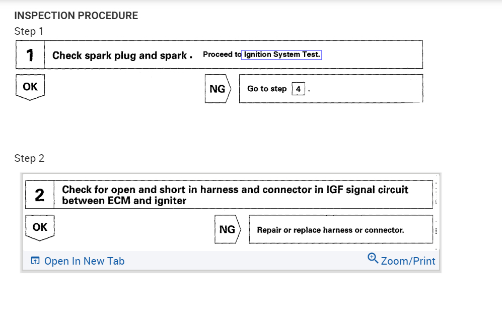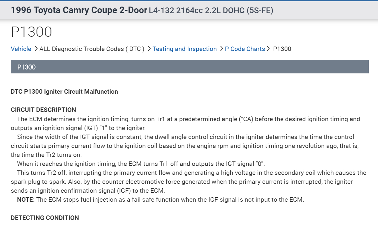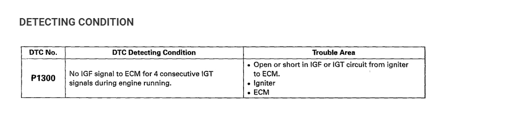 I have included in the diagrams down below the factory diagnostic troubleshooting guide for tracking down the problem for Direct Trouble Code (DTC) P1300 for your vehicle. Please go through this guide and get back to us with what you are able to find out.