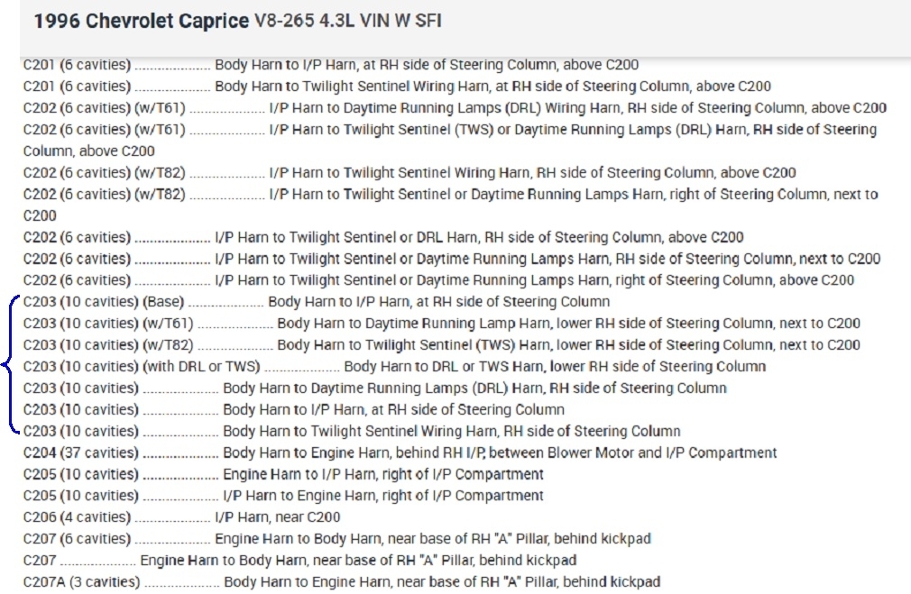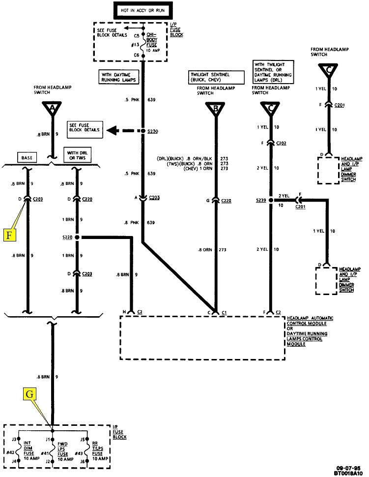 The diagrams for the fuses you listed don't go all the way to the bulbs, but this case, your measurements have this narrowed down already. On the first diagram, you found 12 volts up to point "E", coming out of the headlight switch. It's missing at point "G" on the second diagram, those fuses you listed. That leaves basically three things to consider. Probably the most likely suspect would be the connector terminals at point "F". Both sides of that connector would make dandy test points too. I found the list of connector locations and a drawing showing where to look for it. If you can get to it, back-probe both sides next to the wires to see if you have 12 volts on the brown wire. If voltage is only on one side, something is wrong between that pair of terminals. Connectors like this are only needed to allow separate sections or components go together at different times on the assembly line. It is acceptable to cut corroded wires off and splice them together without using a connector.