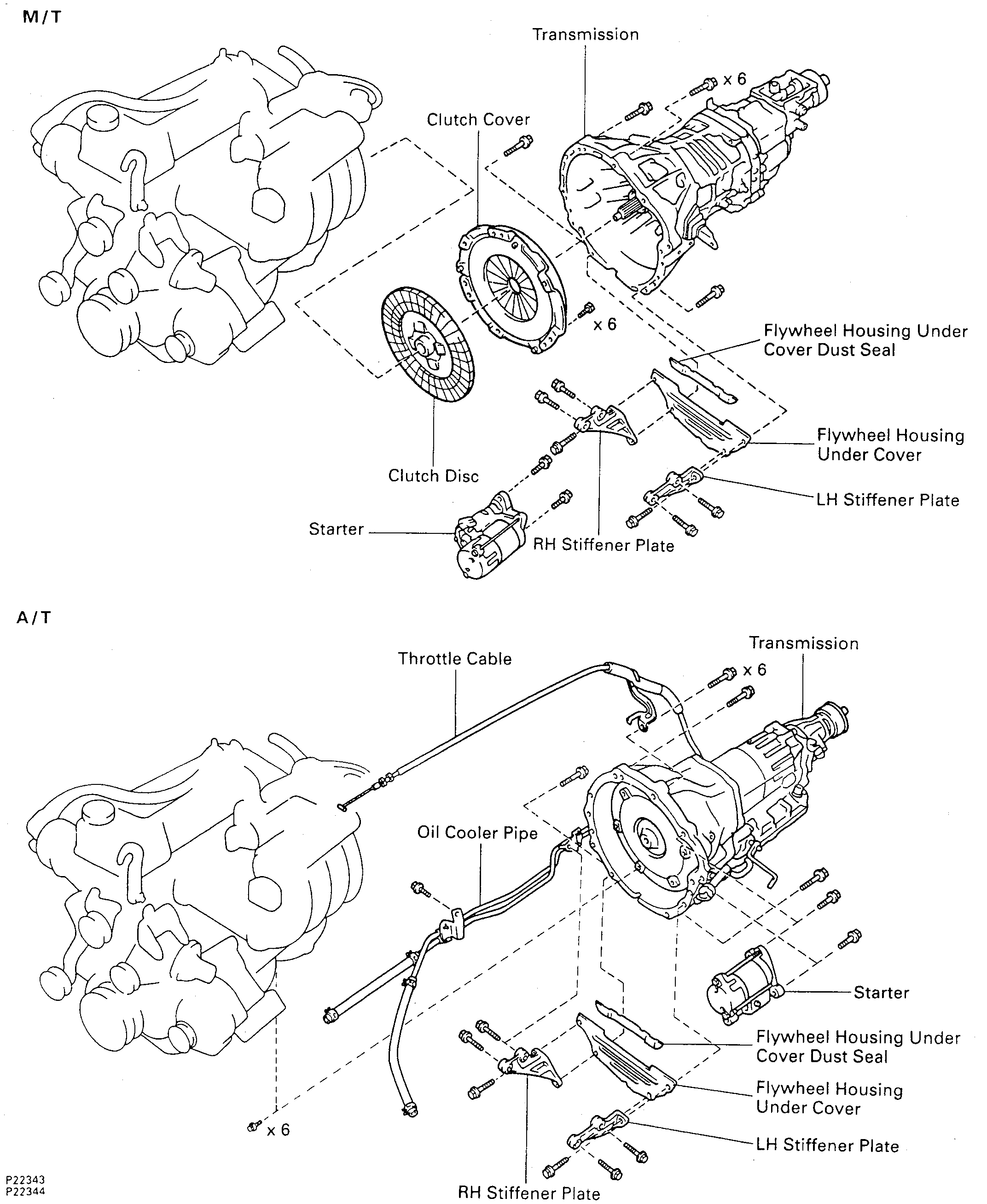 The manual indicates to remove the engine and transmission together. However, here are the directions for transmission removal and replacement.