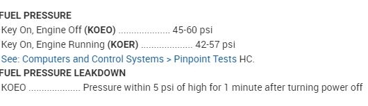 Here are the directions for testing pressure specific to your vehicle. The attached pics correlate with these directions. Also, the fuel pressure specifications are listed.