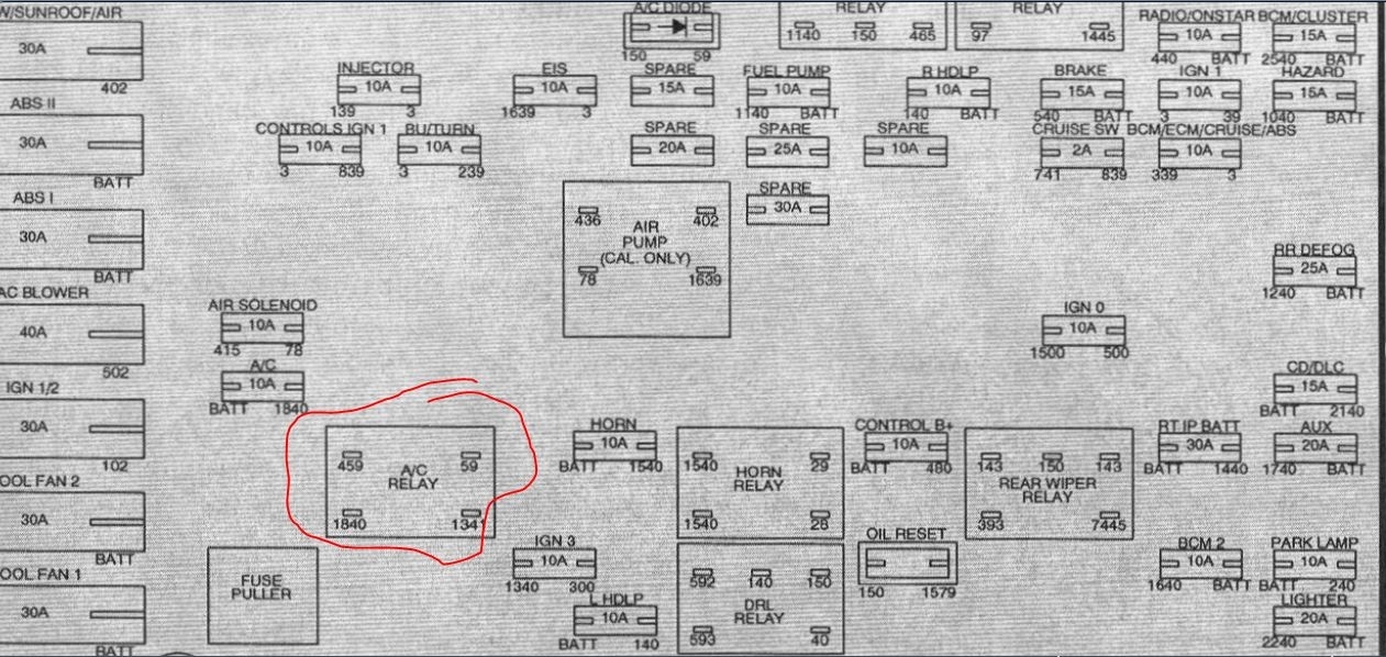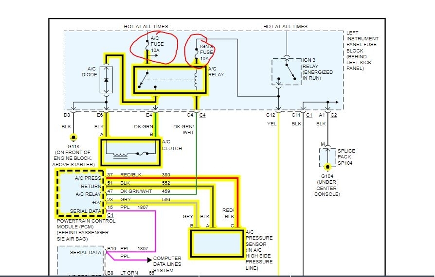 Do you have a test light to do some checks as to why the compressor will not turn on? there are 2 fuses I circled that need to be checked to be sure there is a voltage at the fuse.