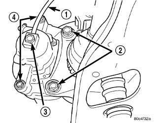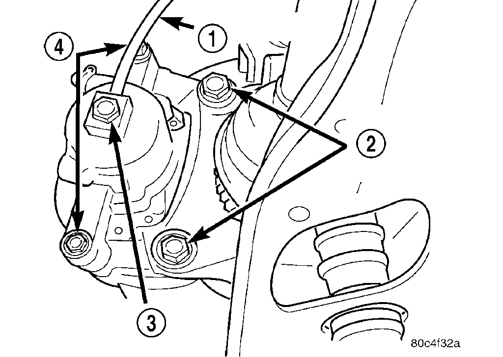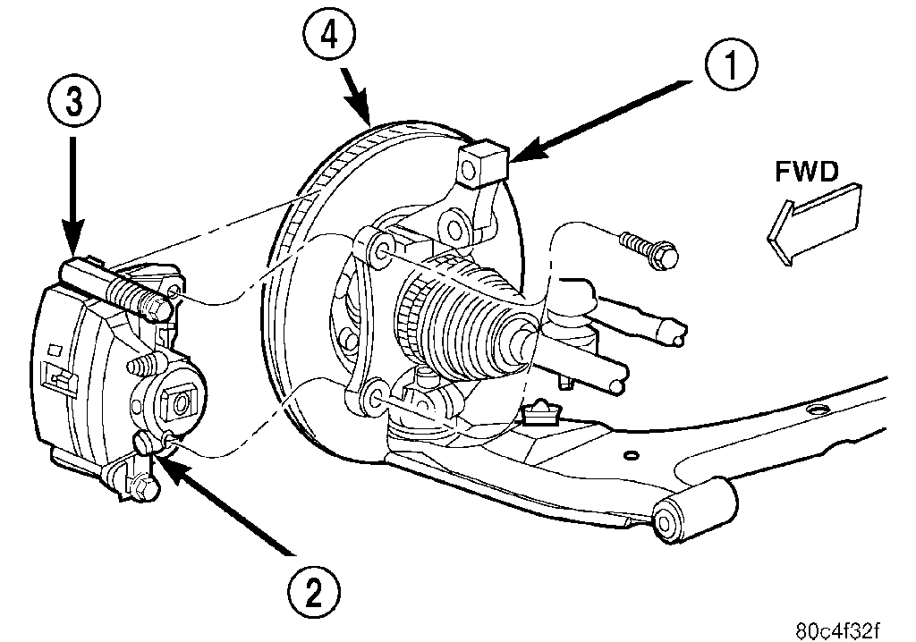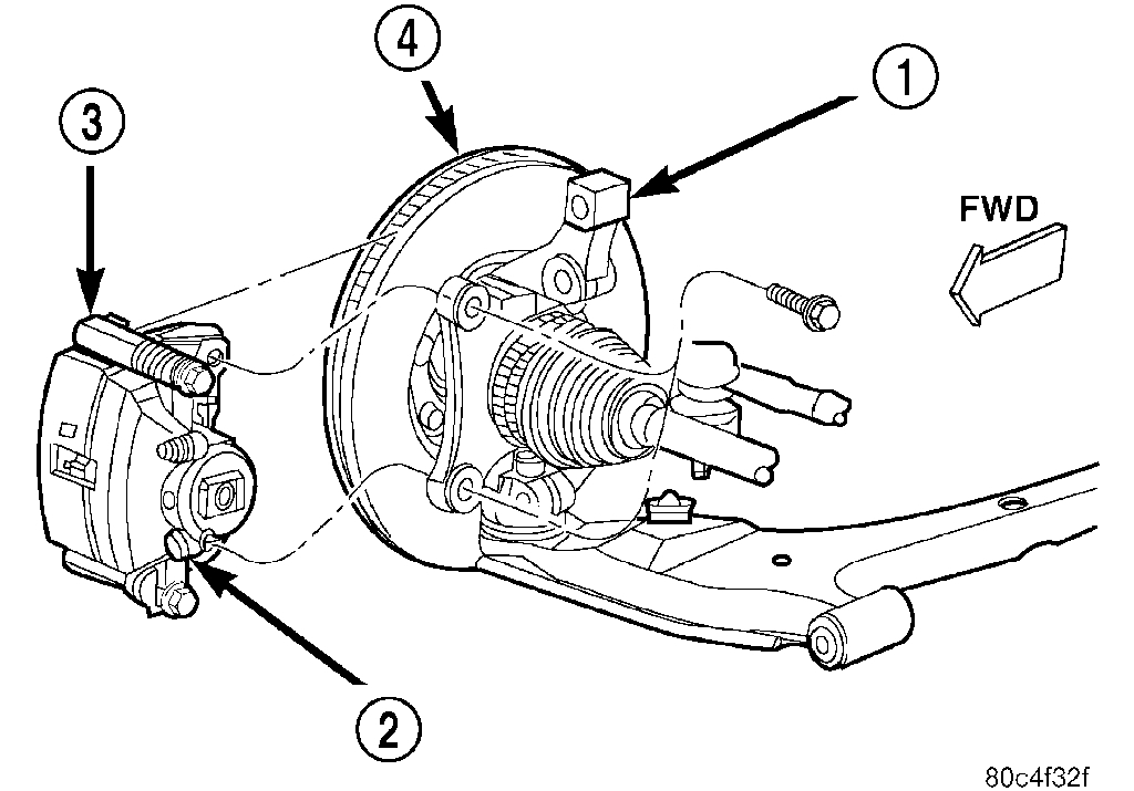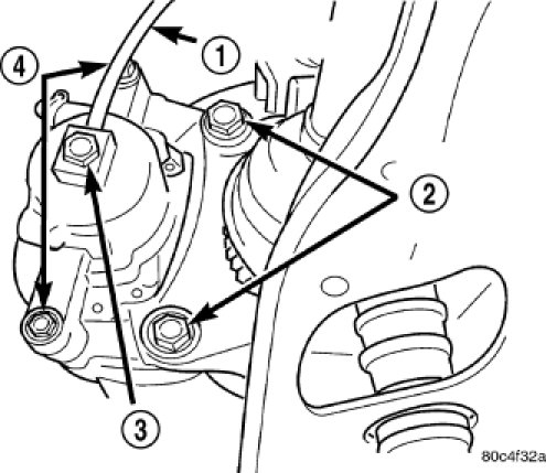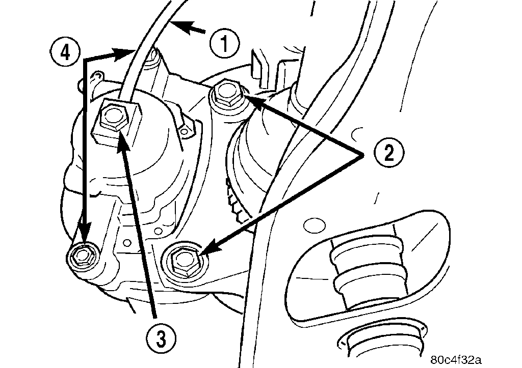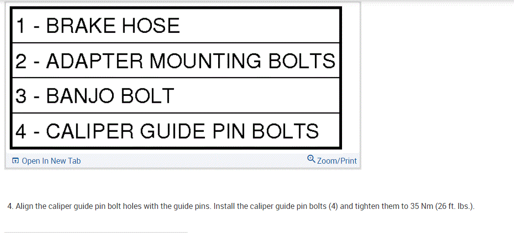 4. Align the caliper guide pin bolt holes with the guide pins. Install the caliper guide pin bolts (4) and tighten them to 35 Nm (26 ft. lbs.).