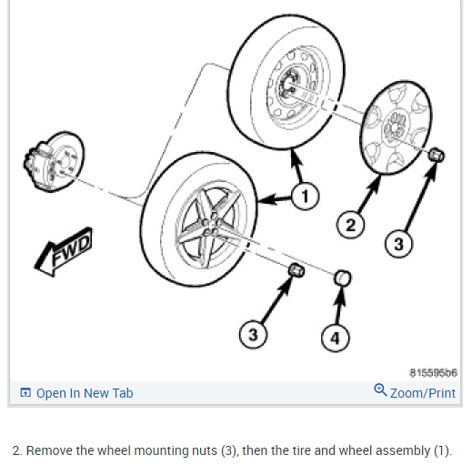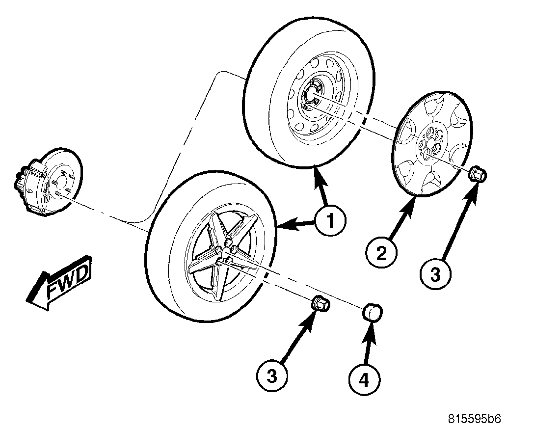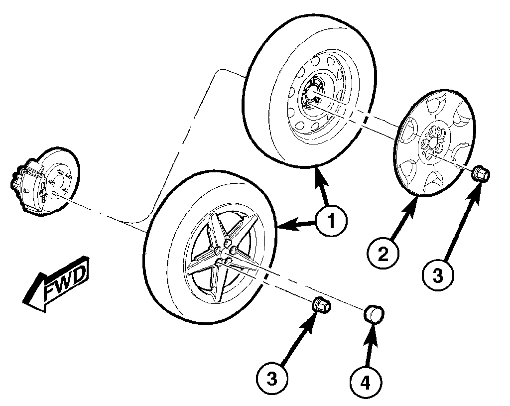 2. Remove the wheel mounting nuts (3), then the tire and wheel assembly (1).