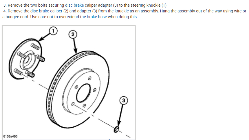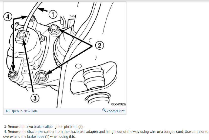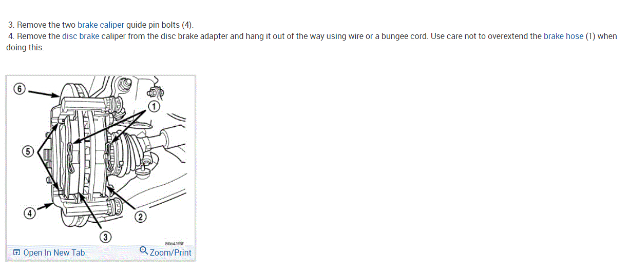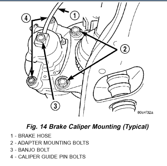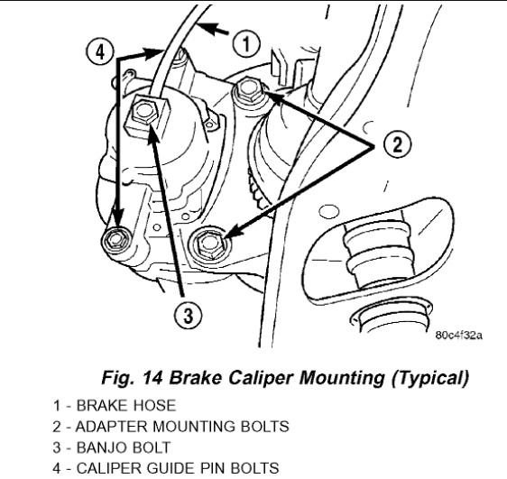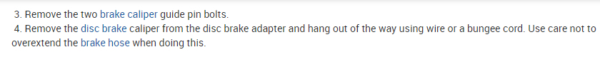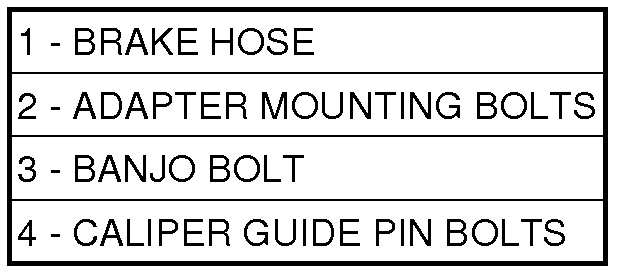 4. Remove the disc brake caliper from the disc brake adapter and hang it out of the way using wire or a bungee cord. Use care not to overextend the brake hose (1) when doing this.