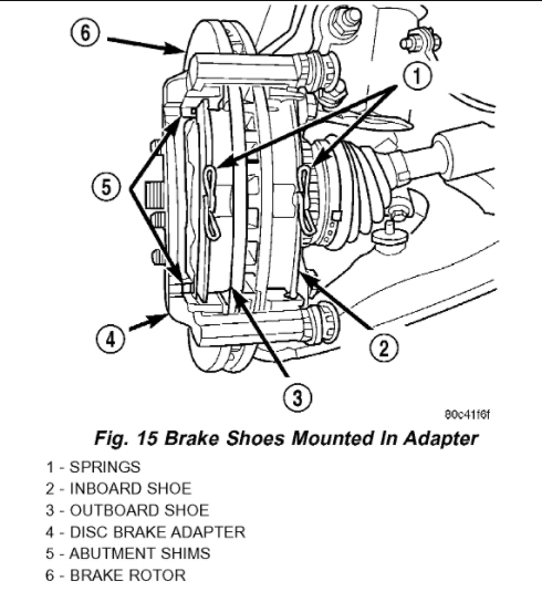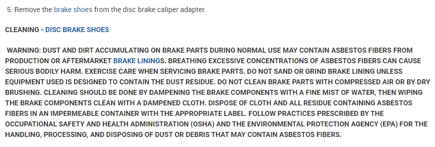 WARNING: Dust and dirt accumulating on brake parts during normal use may contain asbestos fibers from production or aftermarket brake linings. Breathing excessive concentrations of asbestos fibers can cause serious bodily harm. Exercise care when servicing brake parts. Do not sand or grind brake lining unless equipment used is designed to contain the dust residue. Do not clean brake parts with compressed air or by dry brushing. Cleaning should be done by dampening the brake components with a fine mist of water, then wiping the brake components clean with a dampened cloth. Dispose of cloth and all residue containing asbestos fibers in an impermeable container with the appropriate label. Follow practices prescribed by the Occupational Safety And Health Administration (OSHA) and the Environmental Protection Agency (EPA) for the handling, processing, and disposing of dust or debris that may contain asbestos fibers.