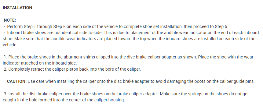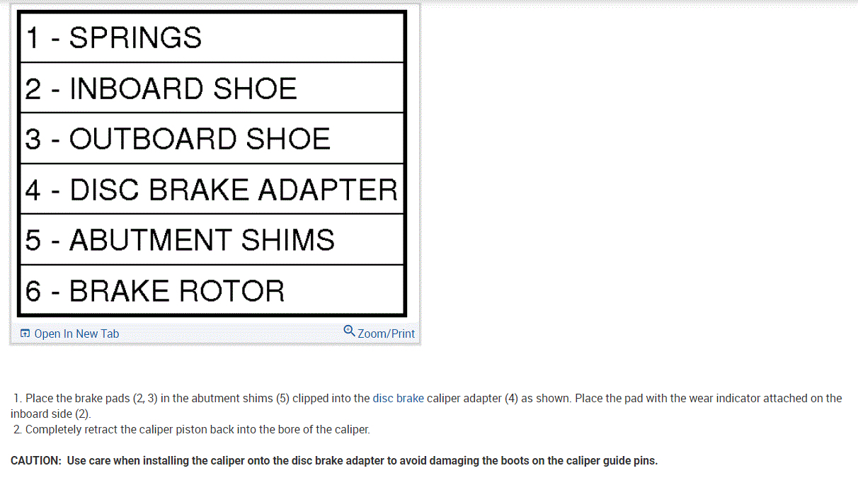 NOTE: Inboard brake pads are not identical side-to-side. This is due to placement of the audible wear indicator on the end of each inboard pad. Make sure that the audible wear indicators are placed toward the top when the inboard pads are installed on each side of the vehicle.