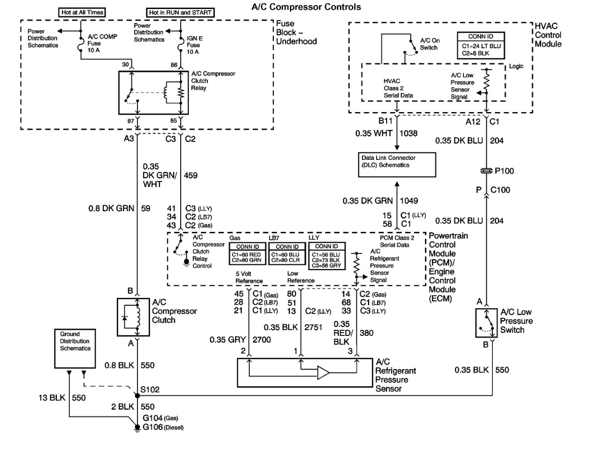 I've replaced: compressor, high- and low-pressure switches, both high- and low-pressure switch pig tails, accumulator/drier and the orifice tube and filter. Gassed the system up with 26 oz of 134-a. (crew cab truck with front A/C only.) When I press the ac button on the control panel the compressor clutch will engage for 1-2 seconds and then kick out. It will engage and run continuously if I jump the pins in the relay. So, I checked the voltage to the pressure switches, low side has 12V to one terminal and 0 on the other. Does polarity matter on the low side switch? And on the high side (3 wire) I have 4.9v on the green wire and neither of the other two (red and black) have continuity to ground. I'm looking to see if there is a wiring diagram for these pressure switches or if I've missed something else.