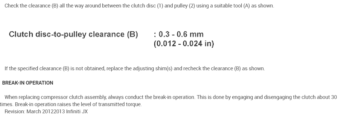 Here are the instructions on how to replace the compressor clutch with the measurement at the clutch must have to operated correctly in the diagrams below. 0.3 to 0.6 mm or .012 to .024 in. Check out the diagrams (below). Please let us know if you need anything else to get the problem fixed.