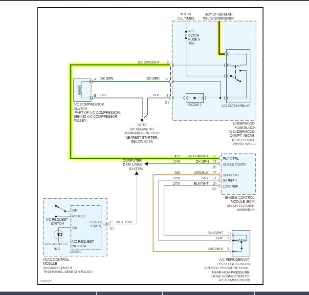 Ignition voltage is supplied directly to the A/C compressor clutch relay. The engine control module ECM controls the relay by grounding the A/C clutch relay control circuit via an internal solid state device called a driver. The primary function of the driver is to supply the ground for the component being controlled. The driver has a fault line which is monitored by the ECM. When the ECM is commanding a component ON, the voltage of the control circuit should be near 0 volts. When the ECM is commanding the control circuit to a component OFF, the voltage potential of the circuit should be near battery voltage.