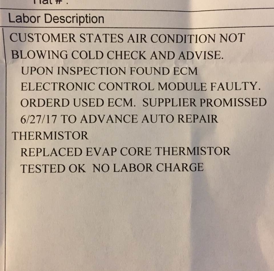 My a/c is finally fixed. Turned out there were two problems. First the mechanic found that the Electronic Control Module (computer) was faulty. He replaced that with a used one. Didn't work so he removed it. Then he ordered a part called an EVAP Core Thermistor (EVAP temperature sensor). He replaced that but the a/c still didn't work. Then he put the "new" ECM back in and, with both parts replaced, it worked. ECM = $200. EVAP = $90. Labor $75. This mechanic is a dream come true. He spent hours trying to find the problem and looking for parts. The only labor charge was for installing the computer. No charge for the EVAP installation or for shipping costs or all the time it took him to find the problem.