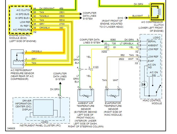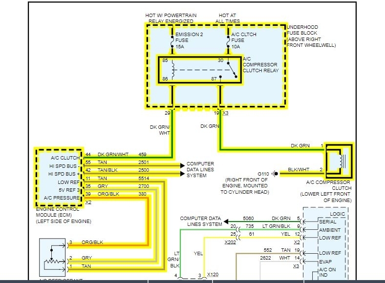 My wife has the vehicle listed above Denali and one day her A/C just stopped blowing cold. The AC "snowflake" light was blinking 3 times and checked pressures and found a bad high pressure sensor. Replaced it and blinking light went away. Still the compressor would not kick over. So far I have checked and replaced the following in this order: