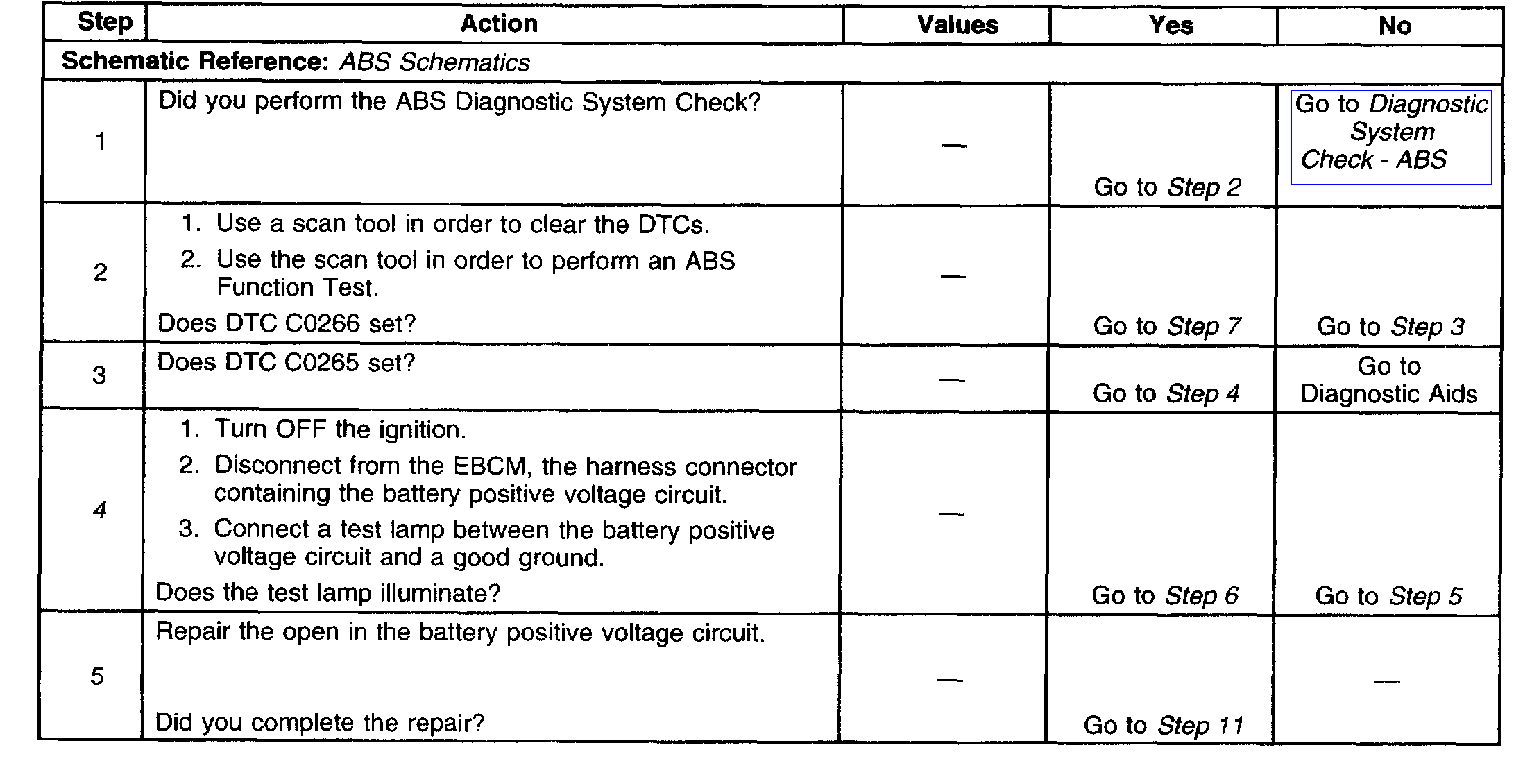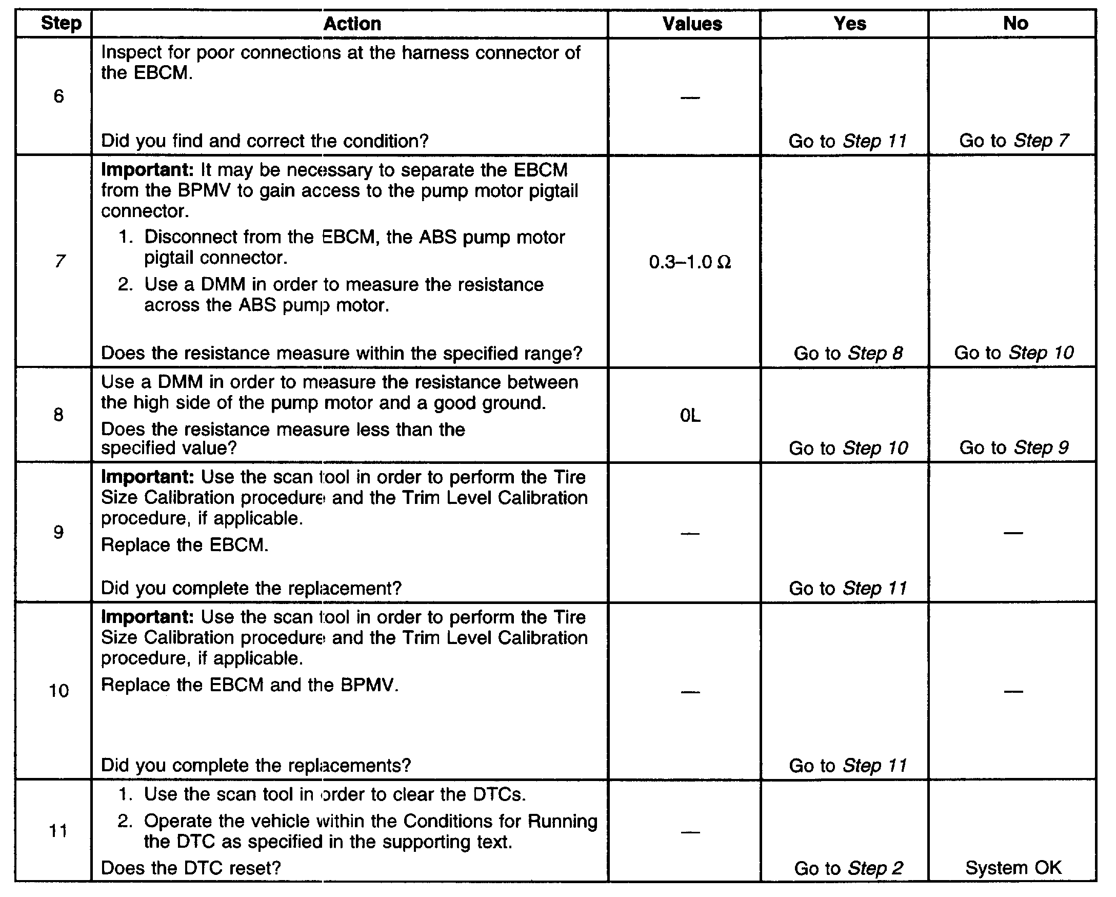 Important: Whenever the EBCM is replaced for DTC C0265 or C0266, the ABS pump motor and motor circuitry must be tested for the proper resistance. Refer to steps 7 and 8 in the diagnostic table below for testing procedures and resistance values.