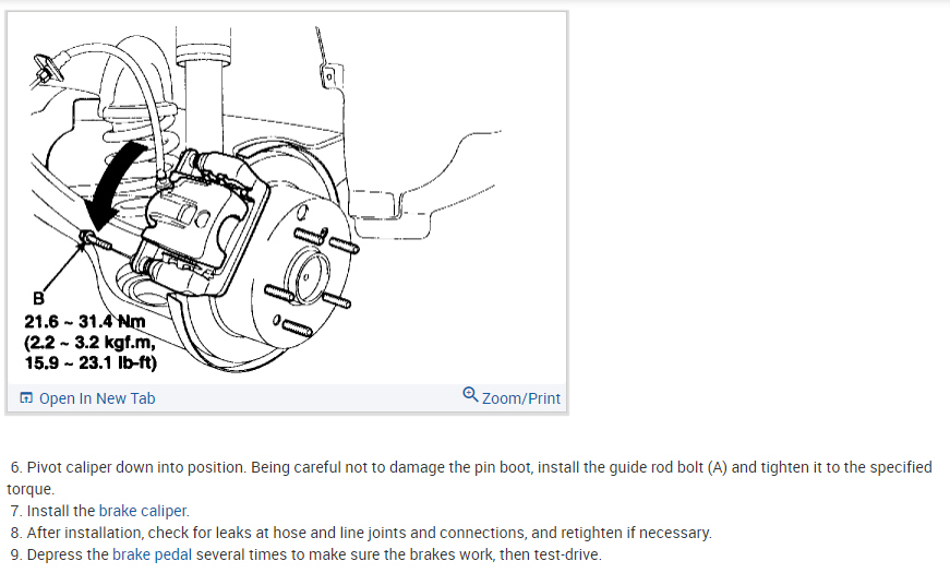 6. Pivot caliper down into position. Being careful not to damage the pin boot, install the guide rod bolt (A) and tighten it to the specified torque.