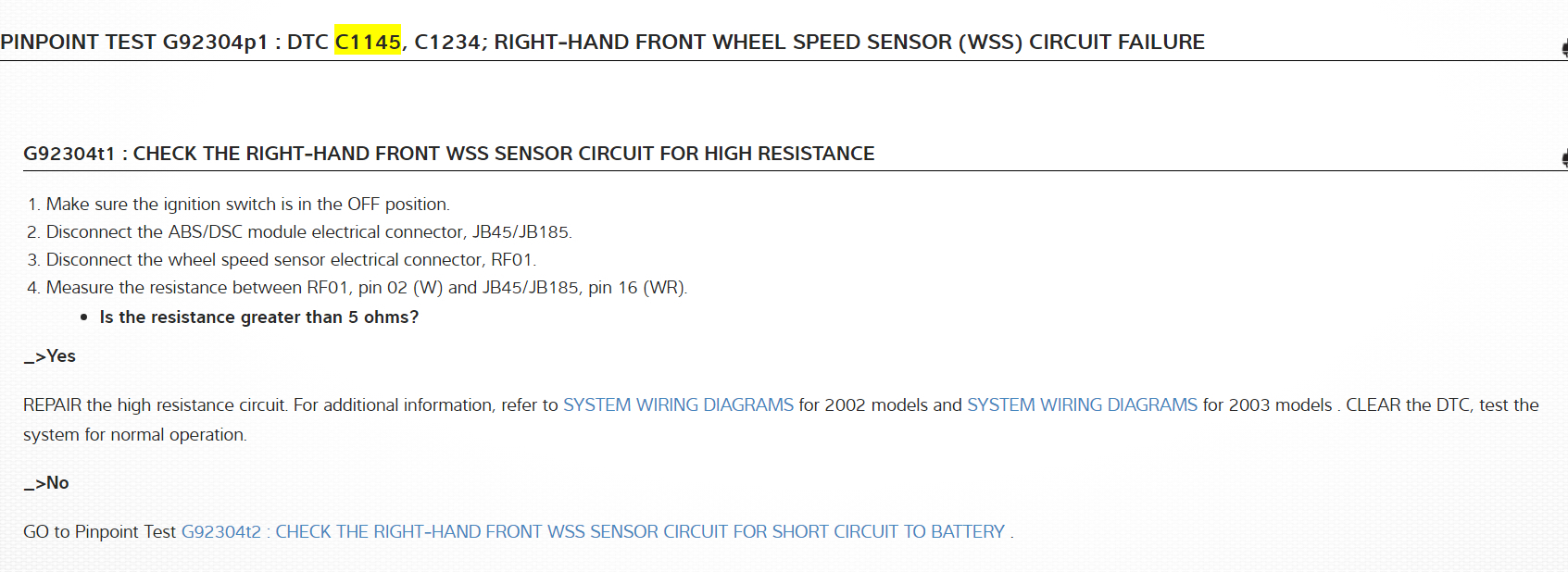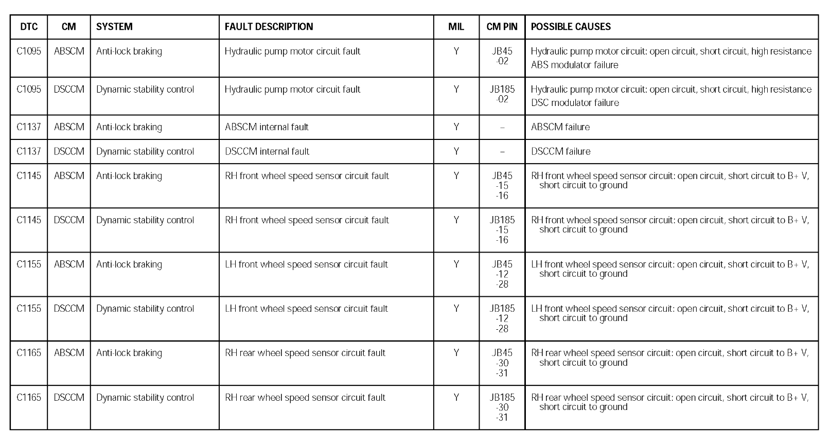 The DTC'a are for an open or short circuit to battery V+ or a short to ground on the wheel speed sensor. DTC P1145 is for RHS and DTC P1155 is for the LHS. These DTC's are also for the ABS Modules, but the DTC malfunction is again for an open, short circuit to battery V+, or a short circuit to ground on the wheel speed sensor. I have included in the diagrams below Pin Point tests that will track down where the fault is in your vehicle. It is straight forward and simple. The issue may be in the connector or associated wiring to the module, and not in the module itself. They also do not require any special tools to do them. Please go through these pinpoint guides and let us know what you find out.