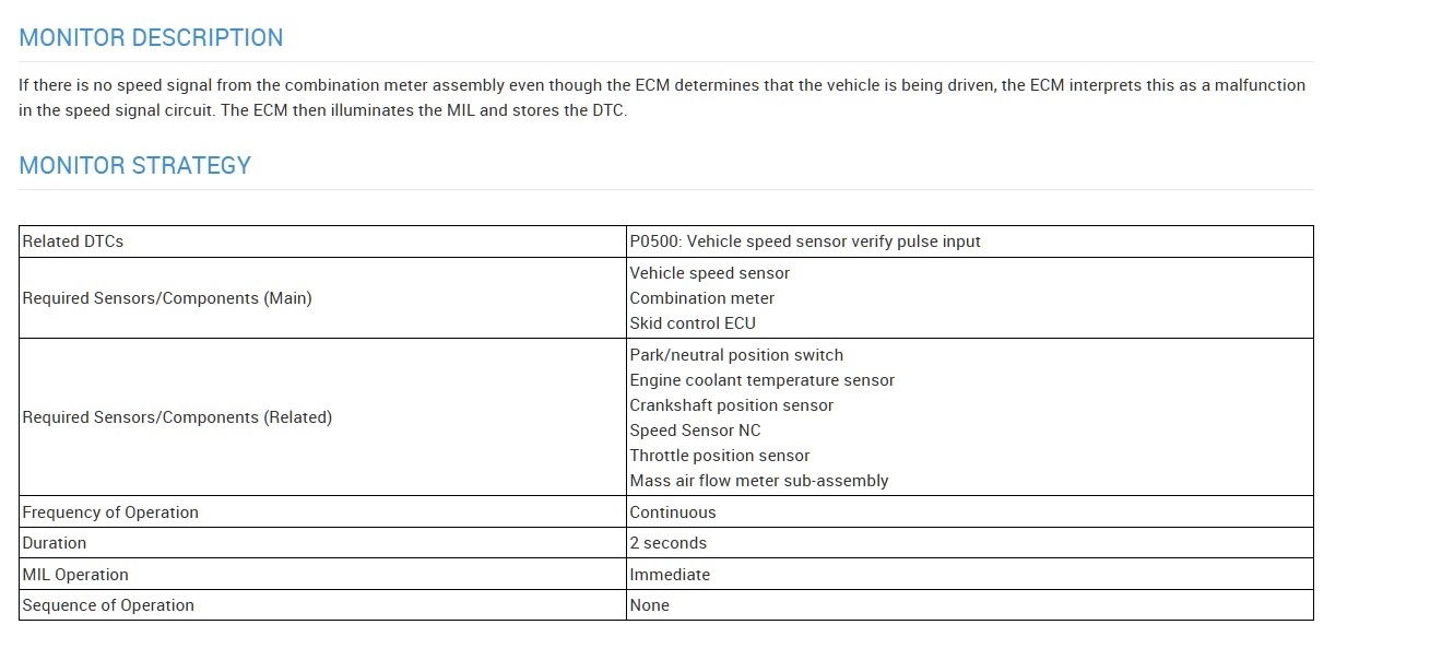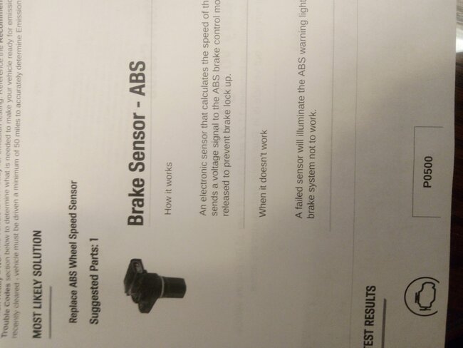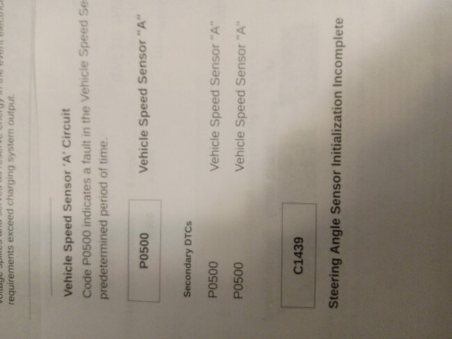 Hello, the ABS/Skid control module sends a vehicle speed signal to the instrument cluster first, then the cluster transmits that signal to the engine computer(ECM), so it looks like this is not necessarily a specific wheel speed sensor fault, but more of the ECM not receiving a speed signal from the cluster. It's possible that the cluster is not receiving a signal from the ABS module. I'll post the service info on this code, but the 2nd code is related to this first fault as well (steering angle sensor calibration). So, an open circuit from the ABS to the cluster or an open circuit from the cluster to the ECM will trigger this code. Do you have a scan tool that can check the ABS module and Cluster for any stored trouble codes? Or was this all the codes from the entire vehicle? That printout looks to be from a dealership or shop possibly.