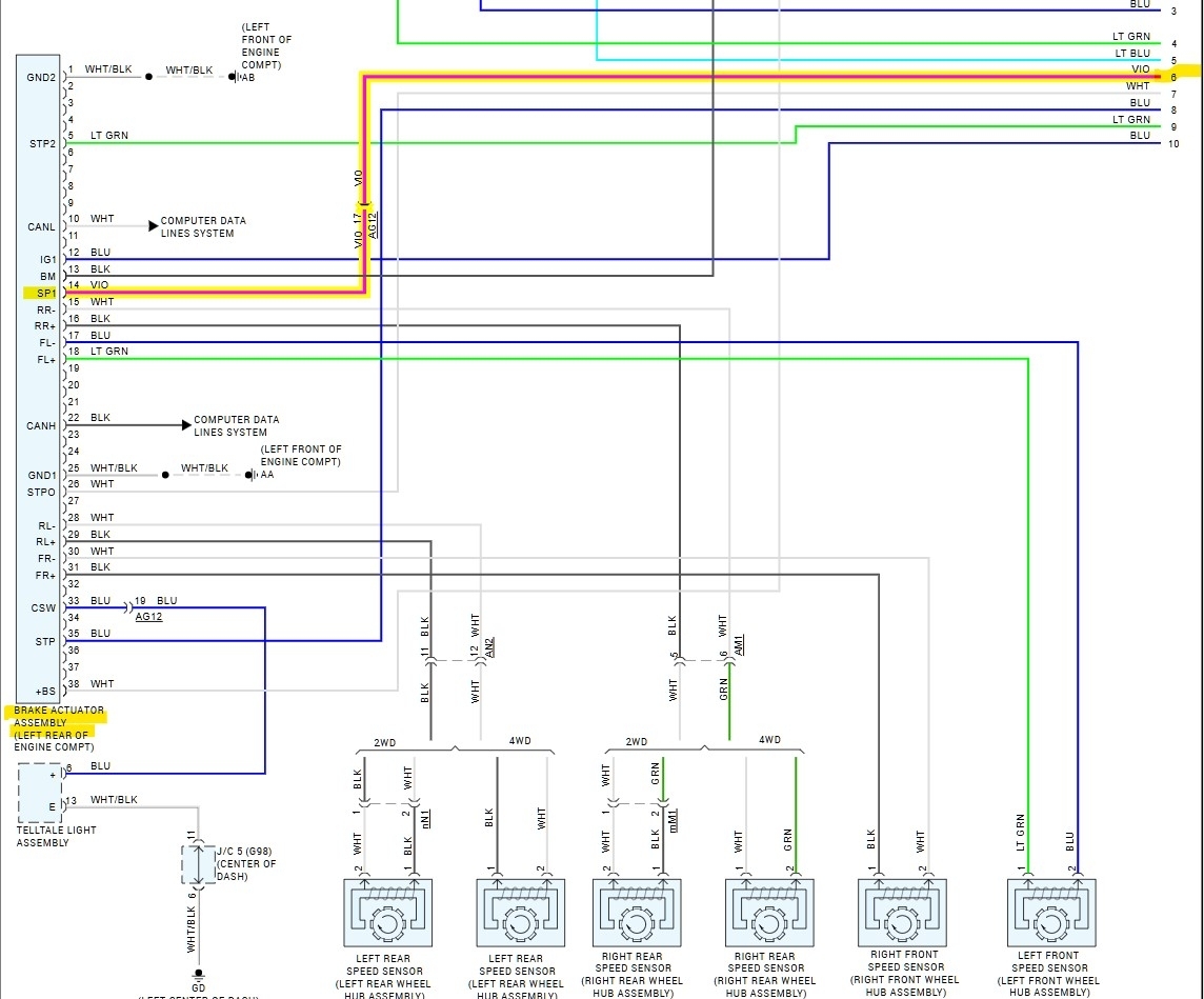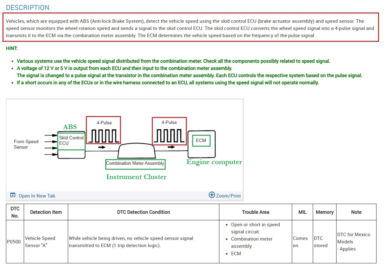 But there should be a 12v or 5v signal, being a 4-pulse signal coming from the ABS, to the Cluster and the same 4 pulse signal is sent out to the ECM to determine vehicle speed. You could check the wiring from the ABS for any shorts to ground using a multimeter, but the Cluster should be unplugged first to isolate the circuit. If you're comfortable with this testing, we can walk you through it.