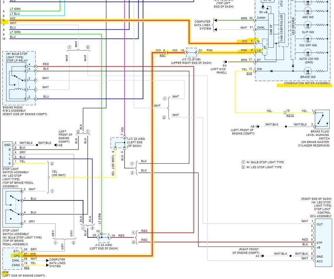 The wiring diagrams shown here (6,7) show the one wire from the ABS module to the Cluster, then out to the ECM. But I would start with checking any live data if possible. Or we can go right to checking the wire integrity, the instrument cluster is not always the easiest to get to though, some can be quite difficult to get out since the connector is going to be located on the back of the module.