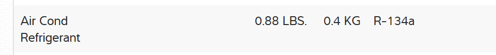 .88 lbs of R134A. See picture make sure that there is oil in system as well if completely overhauled 3.5 oz of pag 46 for compressor and .7 for condenser.