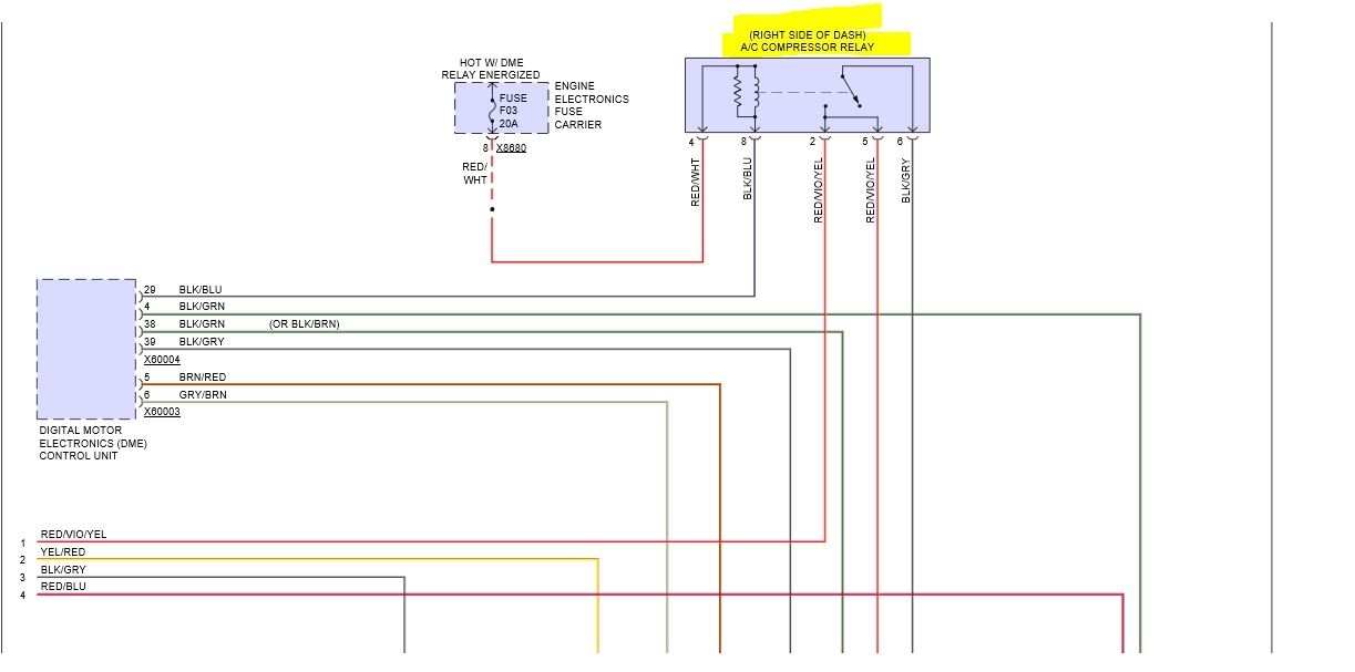 Hello there and thanks for using 2CarPros.com. Here is a wiring diagram of the A/C compressor relay located under the right side of the dashboard, assuming that is what you are looking for. Hope this helps. You can locate it by looking for the correct wire colors on the diagram.