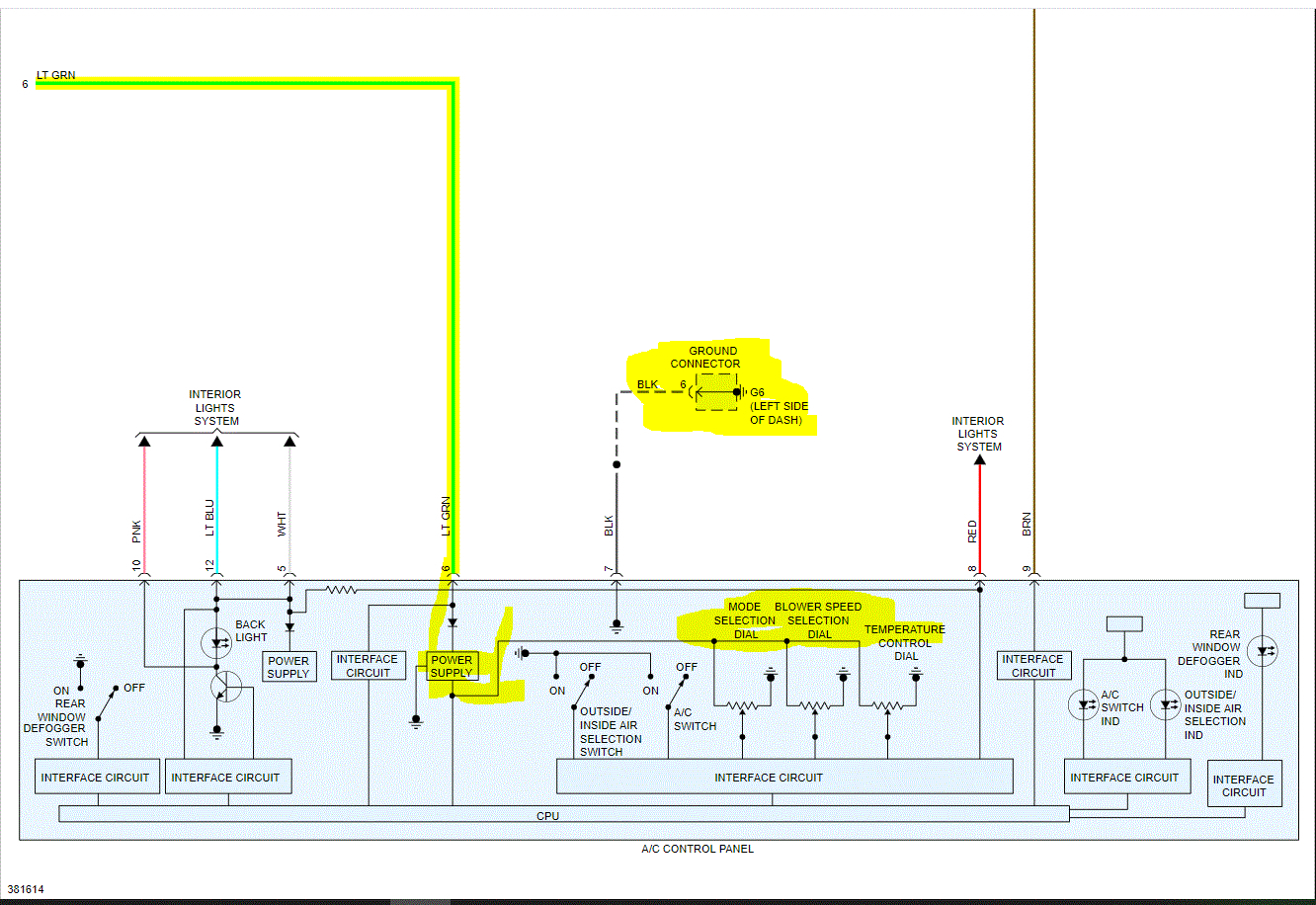 If you look below, I attached the wiring schematic for the AC system, which includes the fan speed control. There is a yellow wire with a green tracer that powers the control panel. Check that wire for power. Also, confirm the ground I highlighted on the last pic.