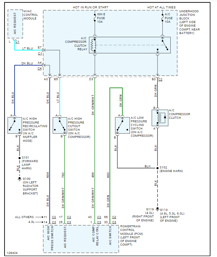 A/C compressor locked up, burnt off belt. Replaced A/C compressor, belt, pulley, high and low pressure switches, actuators on interior cab. Jump pins on relay and ac clutch activates. Also replaced interior HVAC control panel. Out of options other than tracing blue wire from relay to control panel. Seems like the relay just isn't getting the signal to turn on. Also, when manually trigging compressor the low sideline seems to frost up, but never blows cold inside cabin.