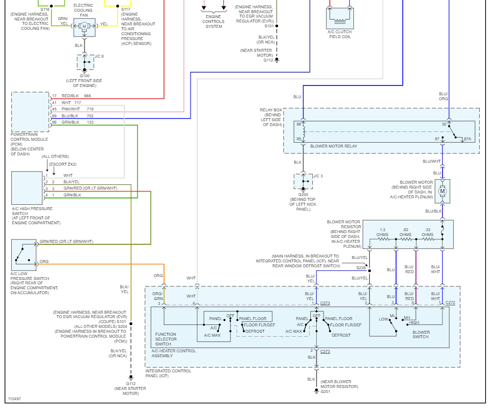 Explanation: I have done jump test, the high-pressure switch has 4 contacts, two of them are normally closed, so when the connector is removed and those contacts jumped, the clutch turns on and compressor works with both radiator fans running on normal speed, and when other two pins jumped, radiator fans start high speed.