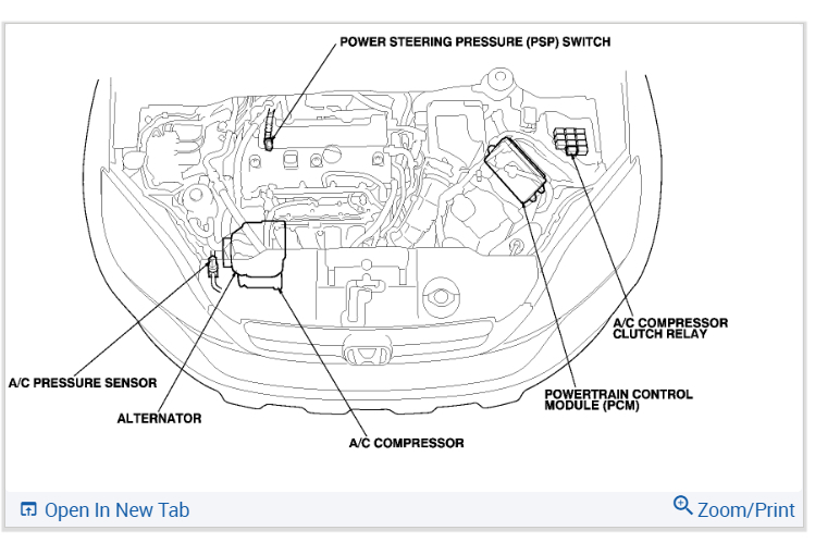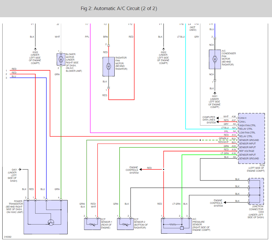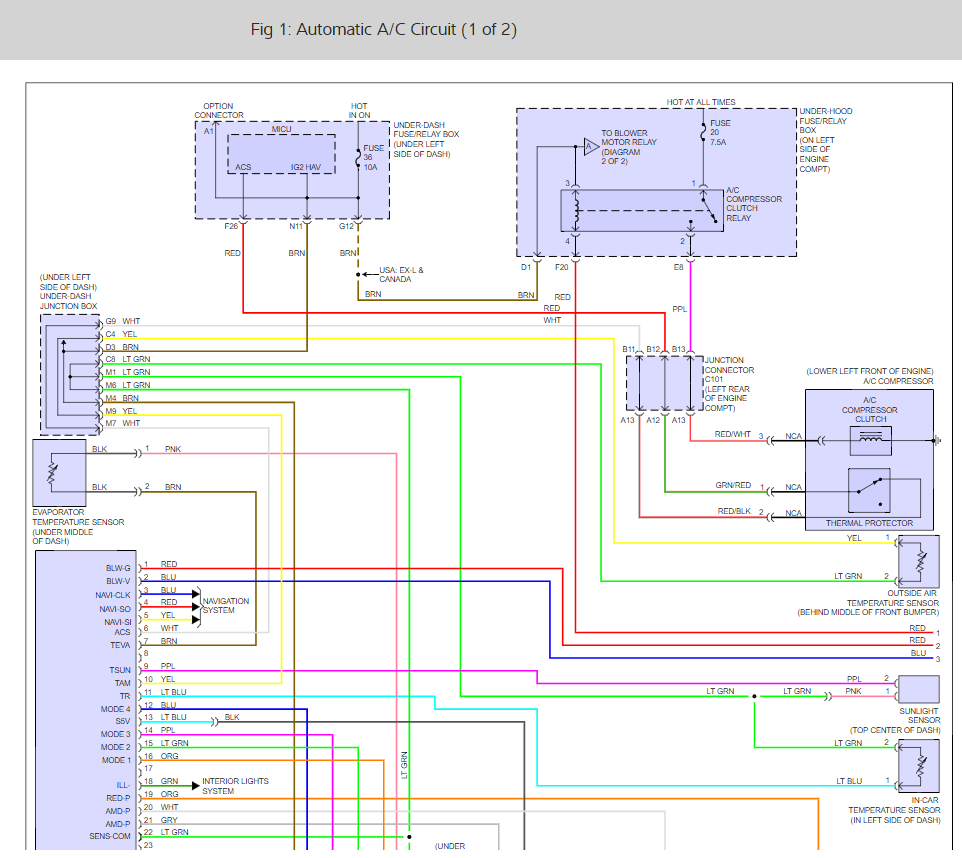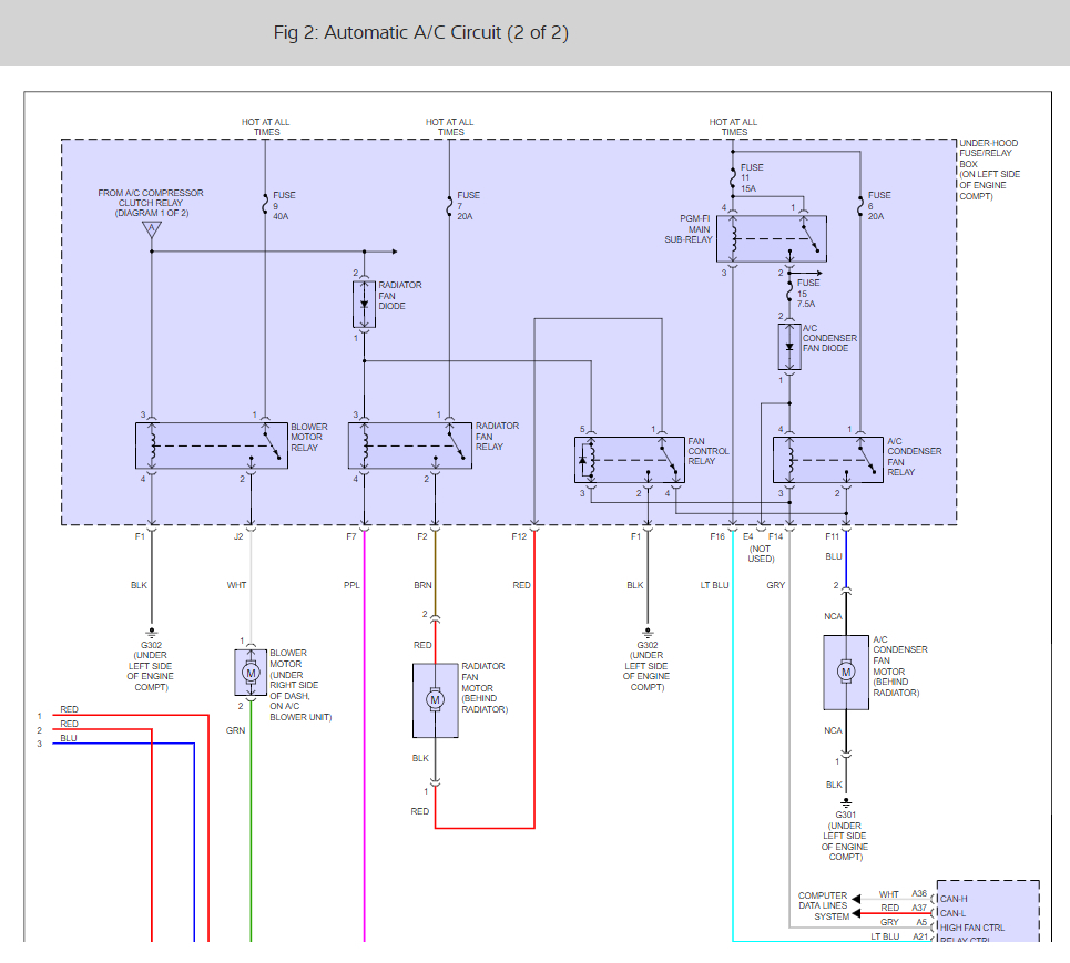 When you turn on the AC the control head sends a signal to the PCM asking for AC. The PCM activates the clutch relay. This section seems to work as the clutch engages. Now the same signal comes in on circuit A at the top left of this diagram.
