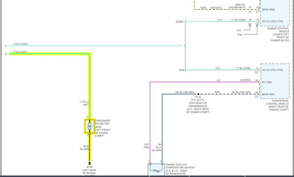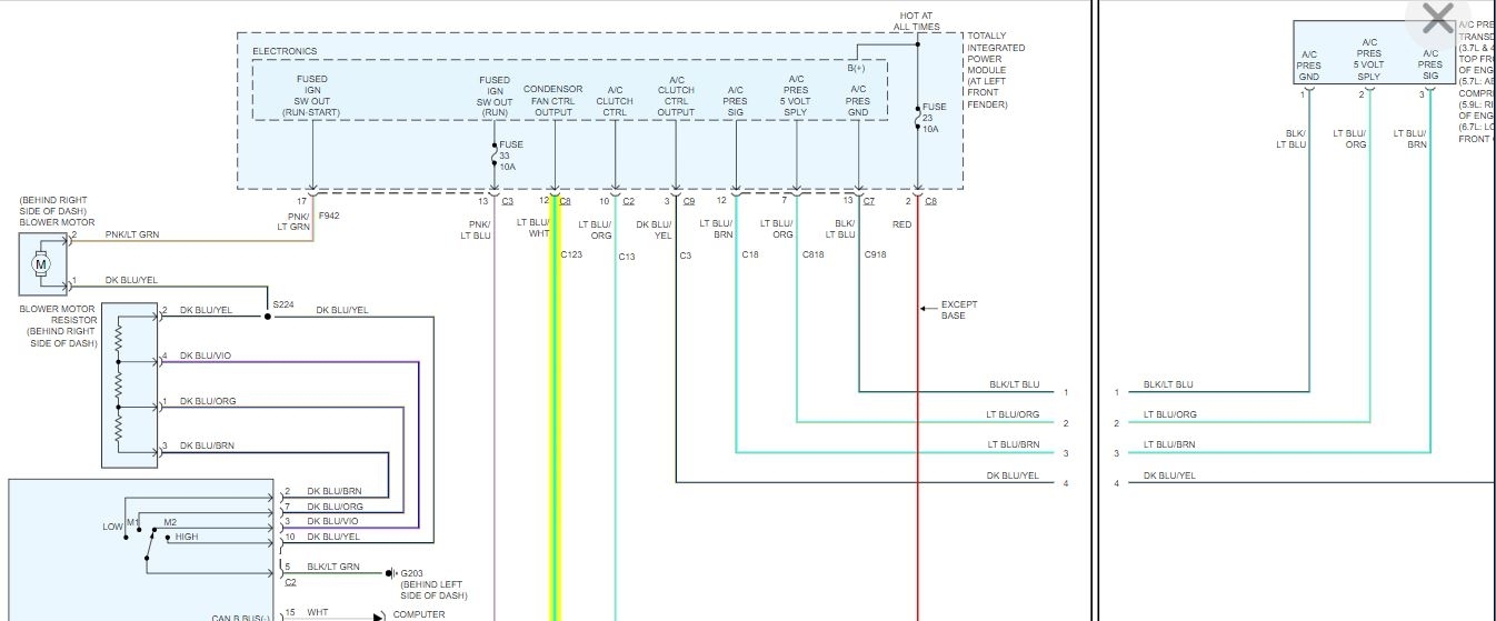 2006 Dodge Ram 3500 ST. 5.9L diesel. 4WD, 6 speed. Had it to firestone and C Classic Dodge up around my area. The A/C is acting up so replaced the condesor, accumulater, and compressor with all new seals. Firestone couldnt do anything because there was sealant in the a/c and according to him his machines couldnt handle that because it would clog it. So he suggested an actual dodge dealer. So the next week set up an appt with C Classic Dodge in Clearfield, PA. They told me that the a/c isnt working because my engine fan is faulty and that the plug in the harness was tapped up and tucked into the bottom of the engine somewhere. So he tells me that since that fan is spinning fast enough it isnt cooling the a/c condensor enough which is causing my a/c to not work. I know a little bit about trucks and such. Learning a lot about diesels just by having one. I learn from experience and a lot of research from different sources. But never had to mess with the fan on any of my vehicles. So with my fathers help he figured that the fan clutch system that is on it now is just a manual one with no electric to it. You could see the fan and whole clutch motor spinning and C Classic was trying to tell my father it was electric and he replied how can it be electric when its spinning? So then they tell him that it is the wrong thing. Why couldnt they have told me that in the first place. Regardless, so here is where i am at. So what i need is a picture or schematic on what this bracket looks like that holds the electric fan clutch and what the fan clutch and fan look like so i have a better idea on what im ordering. And in fact this is the problem, would that affect the a/c like C Classic was saying? I have a feeling that the guy where i bought my truck from either switched the electric one out to sell or bought or used another manual one because it was cheaper. Thank you for your time. ~Matt