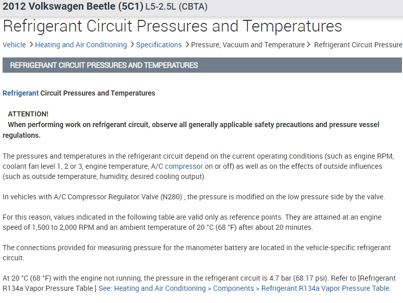 At 20 °C (68 °F) with the engine not running, the pressure in the refrigerant circuit is 4.7 bar (68.17 psi).