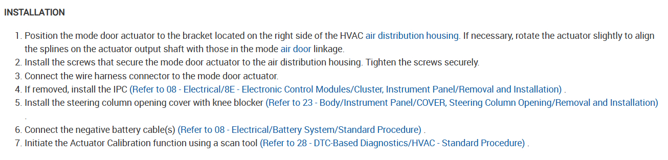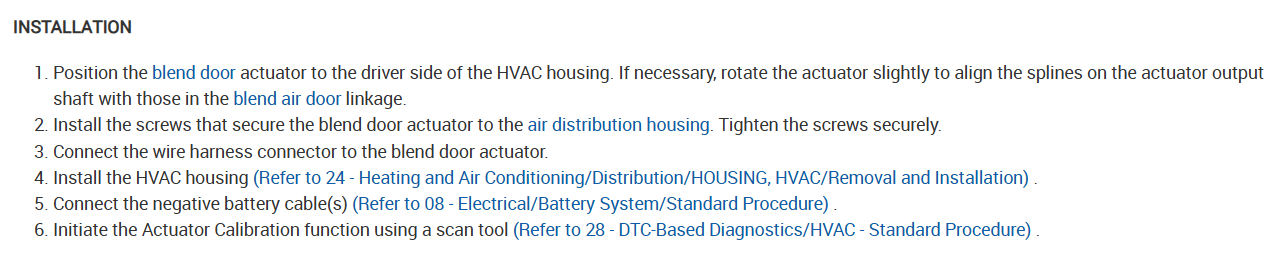 It sounds like the orientation of the blend door drive is not timed correctly or the actuator is defective. Also, it says to Initiate the Actuator Calibration function using a scan tool, did you do this? Check out the images (below). Please let us know what happens.