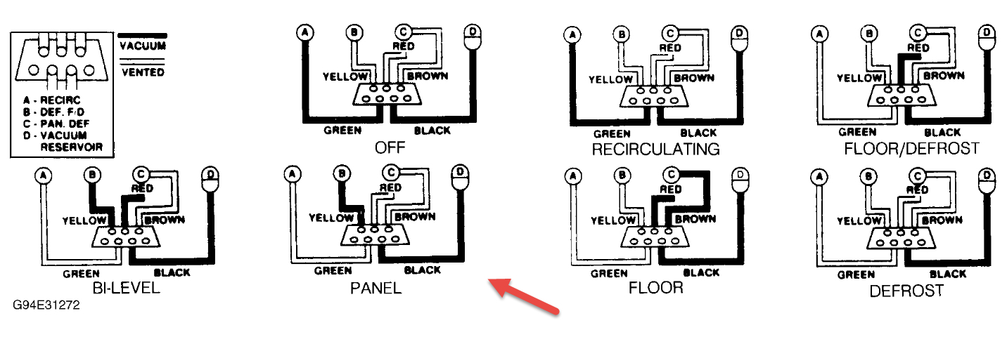 When selected my A/C blows out of my defrost and floor vents but not my front vents. I have checked that I do have pressure at my actuator and I fixed a broken vacuum line under the hood going into the cab on the passenger side.
