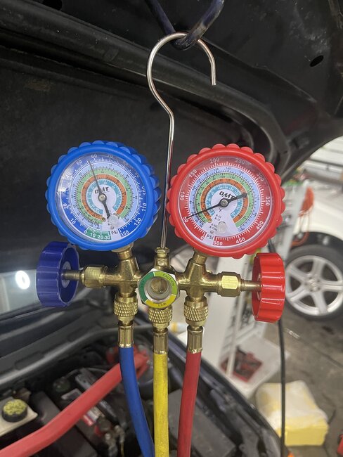 Compressor does not come on the fan comes on when the A/C button is on. compressor turns on by hand ac fuse in engine fuse box is good and has power. checked gauges and the first picture is with engine on, ac on and knobs open on low/high sides but knobs closed at the gauge. second picture is with knob open at low pressure side gauge cannot find any module for ac using a small auto or the auto pro, cannot see any ac modules or anything to do with HVAC. These are only codes it has. Car has few aftermarket stuff like a cold intake maybe but nothing else. I removed the relay and switched it with another same thing. I hear it click when it goes in. Which sides do i jump to see if it kicks on