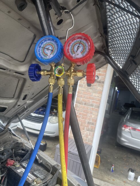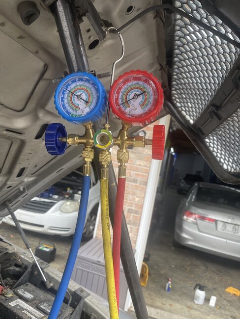 Added a bit to f freon it took it but nothing got better. Checked high side and soon as i opened it it was about 250. After i emptied all the air coming out it has gotten down to 20, added freon to 45 still not cold