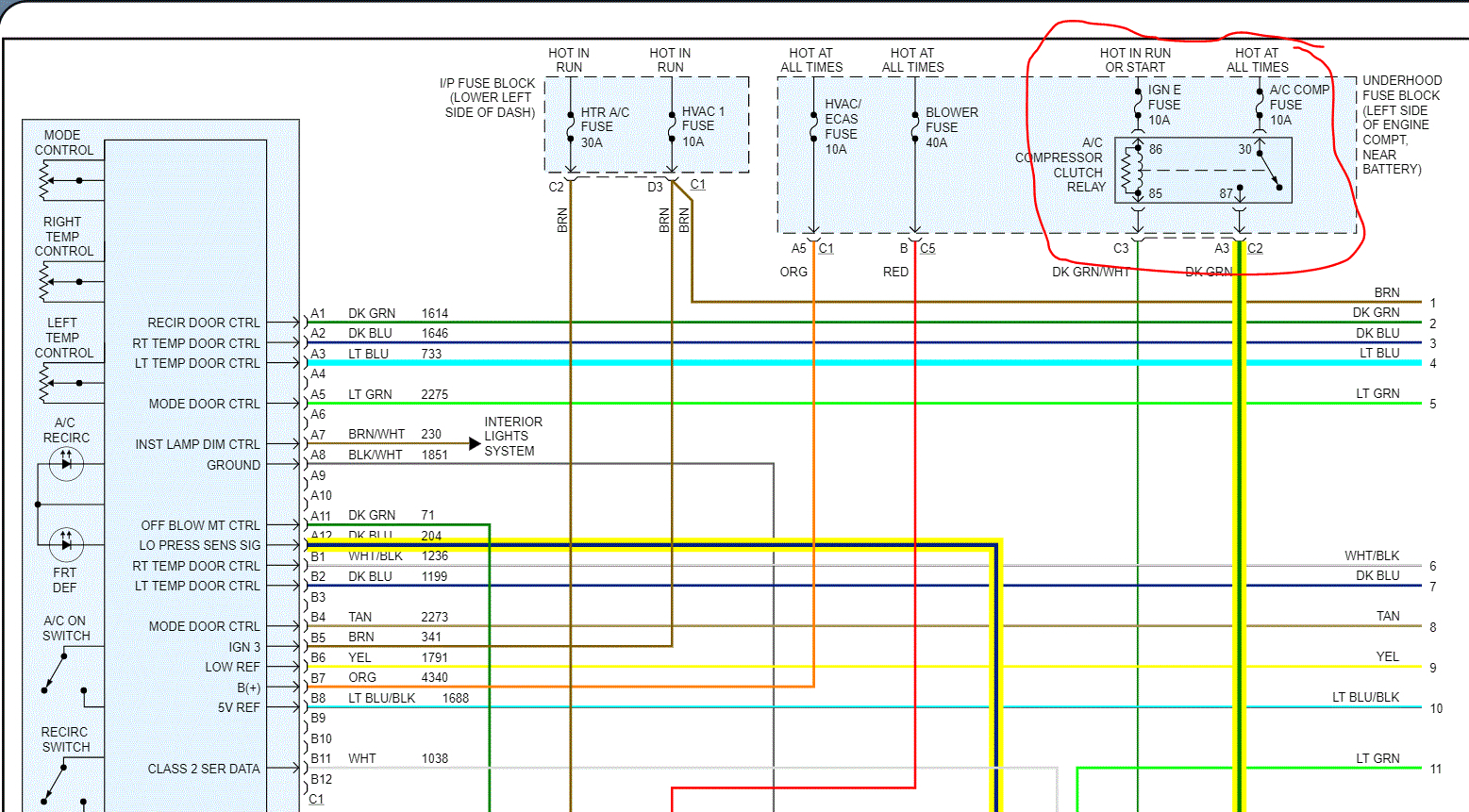 My A/C blows hot, compressor clutch does not engage and the electric fans don't turn on. The system is charged and I have power to the relays and fuses, the pressure switch and the dash controls. My voltmeter does not read power at the compressor or fan connectors. I have found the ground wires on the chassis and cleaned them but still didn't fix the problem.