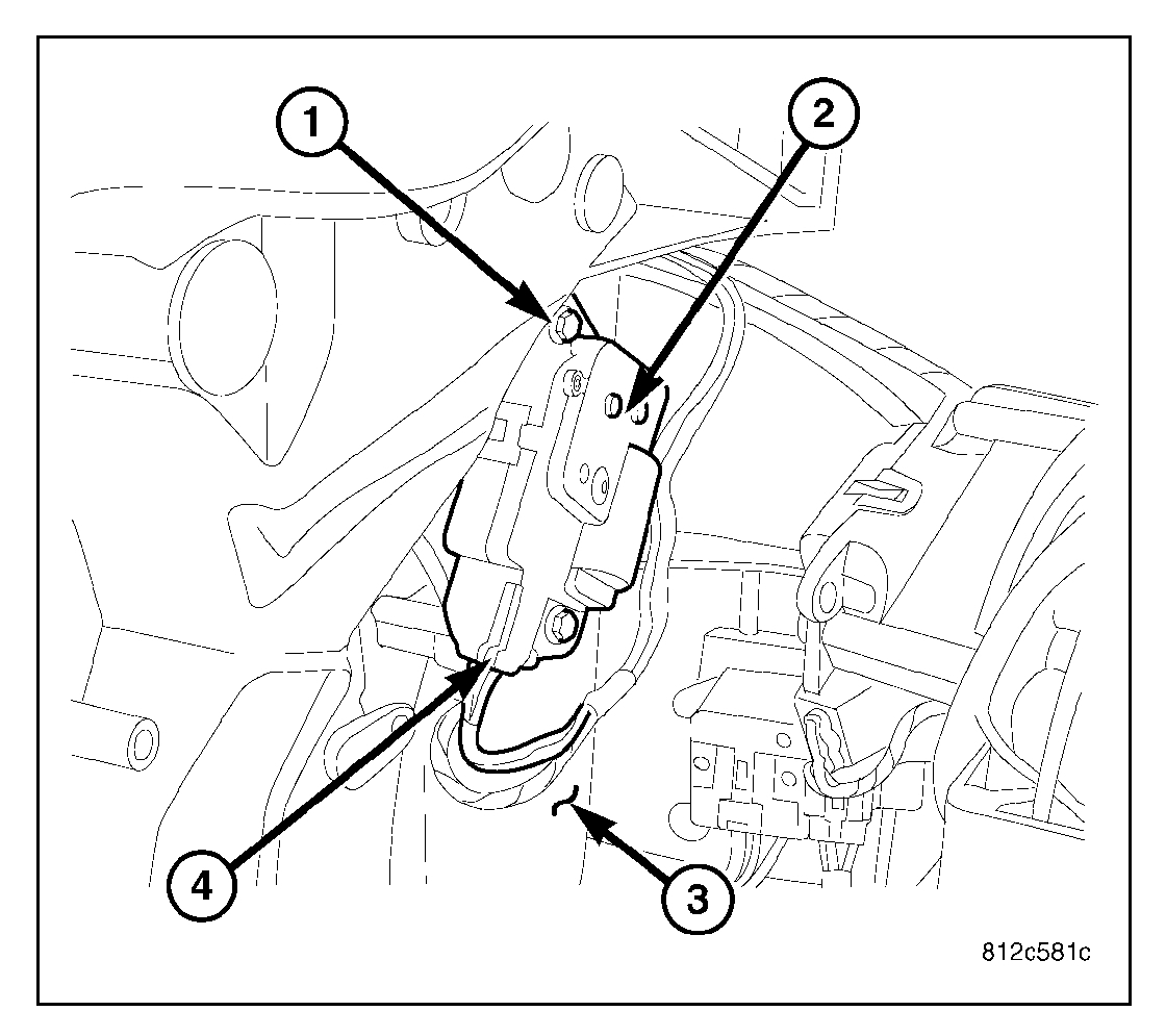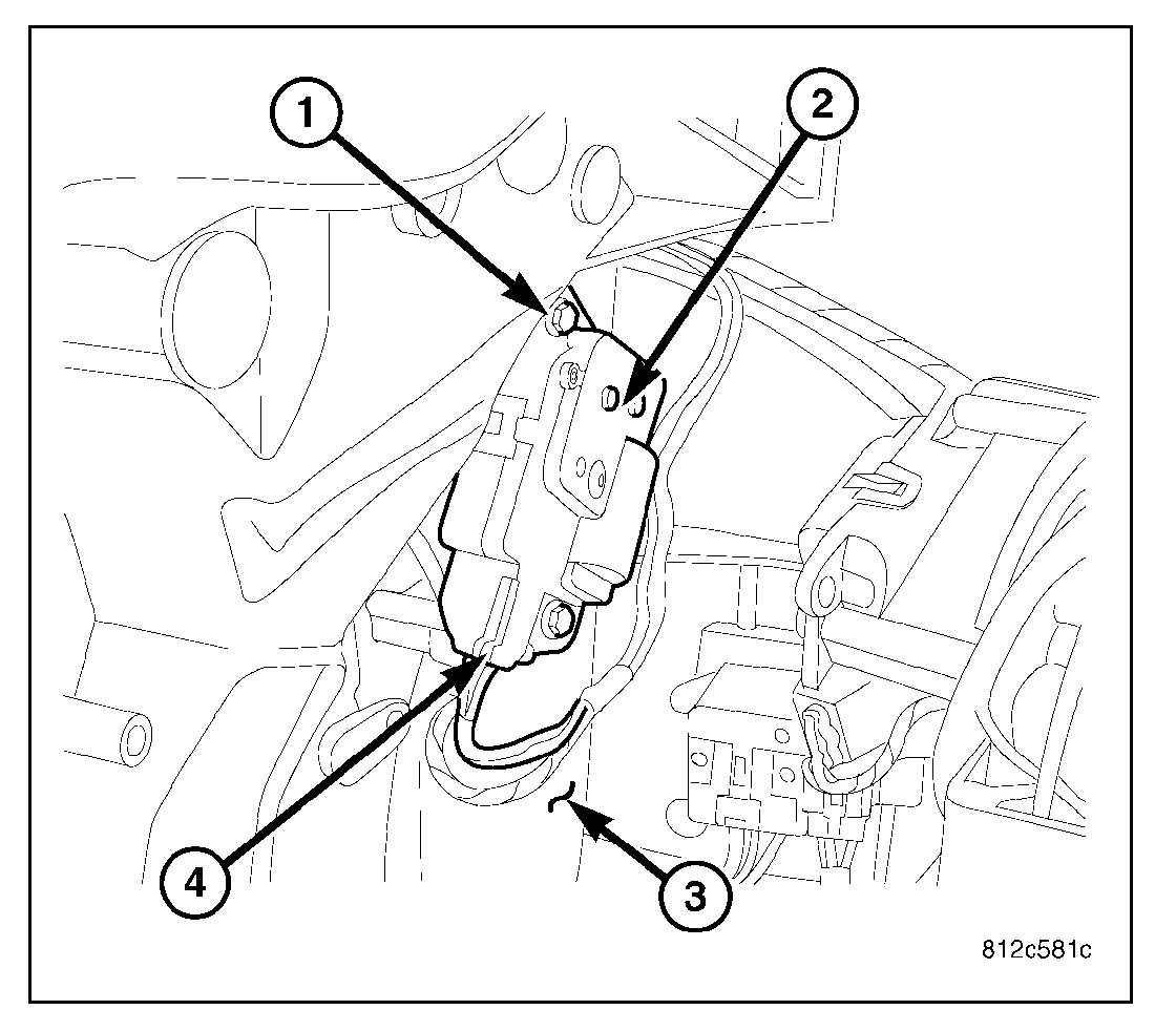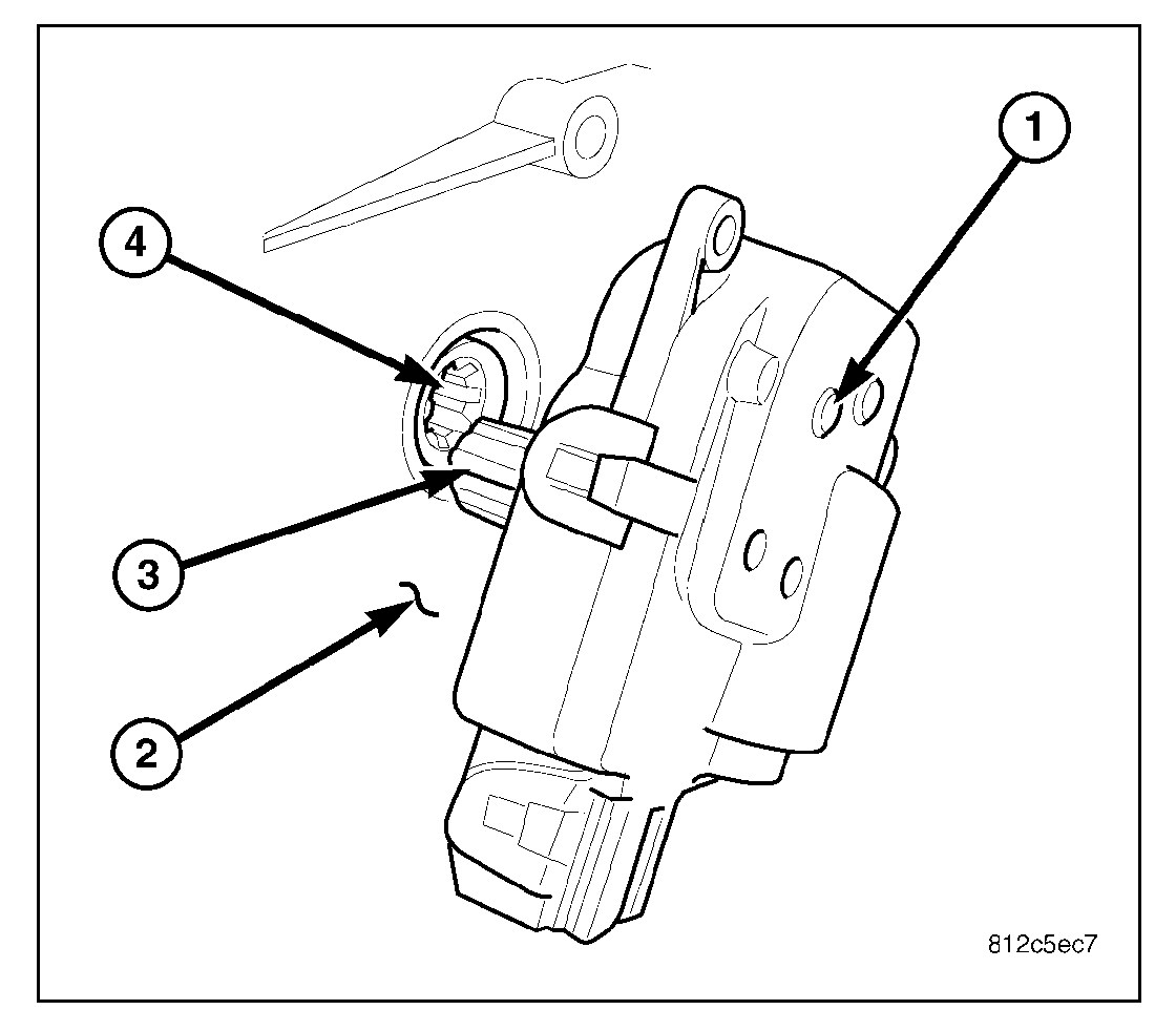2. Install the blend door actuator onto the passenger side of the HVAC air distribution housing (2). If necessary, rotate the actuator slightly to align the splines on the actuator output shaft (3) with those on the blend door cam (4).