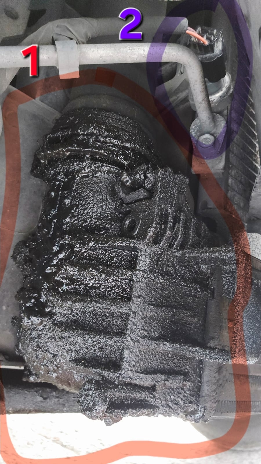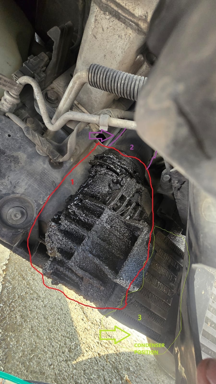 3-Please also look at these pictures attached, showing a "part near the condenser that’s dirty with oil". Could that be compressor oil, and could this leak have caused the compressor to become damaged beyond repair? What part is it?