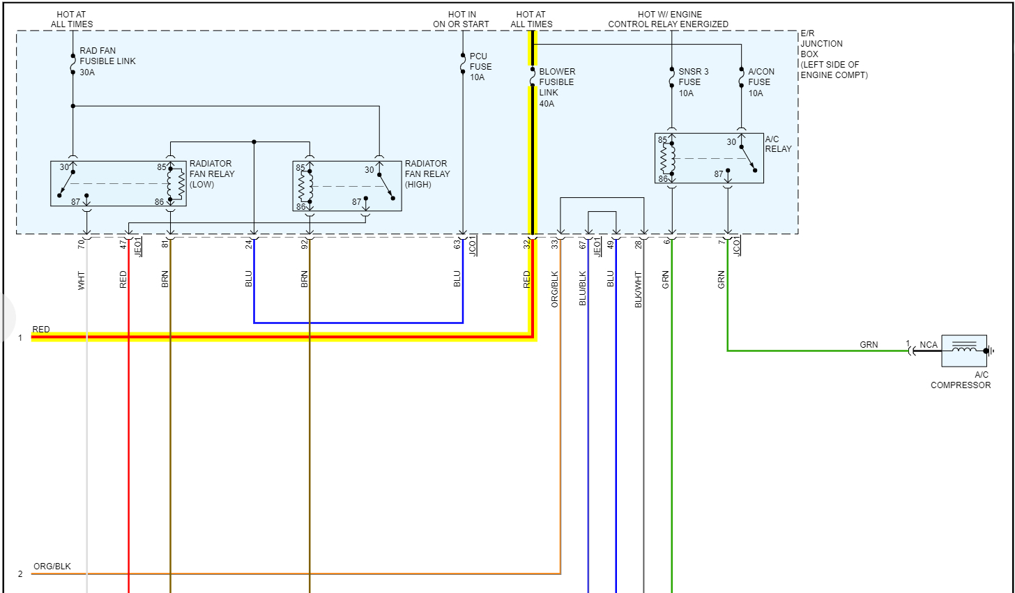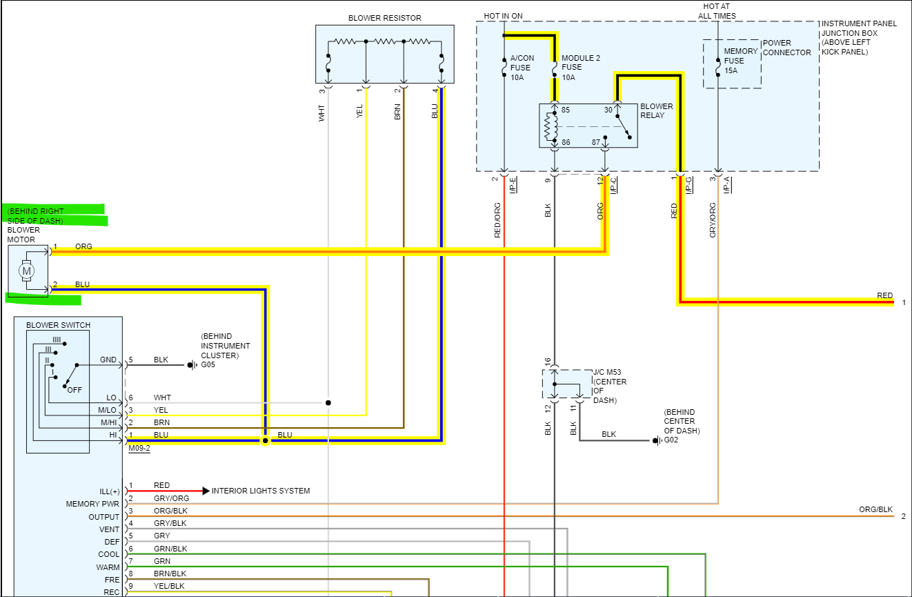 The diagrams below are of the Manual A/C system, just to give you an idea of the blower motor circuits and the fuses that power it