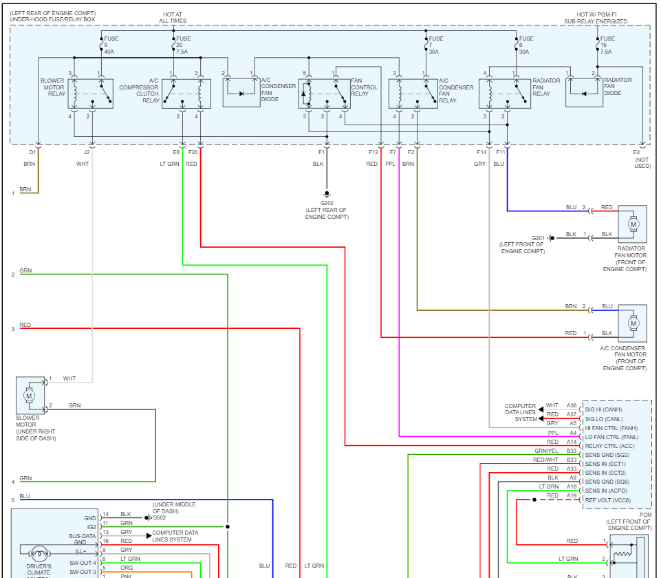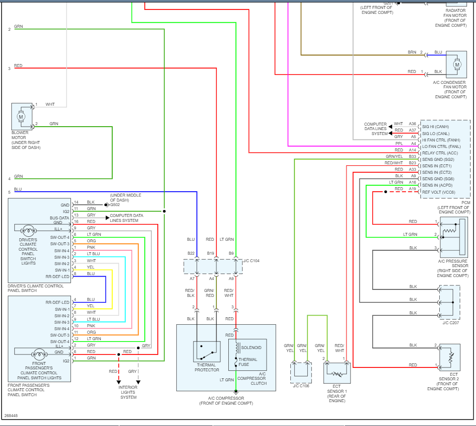 So, A/C wasn't working, there was less than 10PSI in it, i jumped the relay to get 30PSI in it. Now when i install the relay, i still have no A/C clutch engagement but when i jump the relay A/C works fine and blows cold. When i tested with power probe, i have power on the 2 prongs but no ground from ECM->ACrelay which if i power probe the relay with ground while the relay is just half installed, everything works fine. Also, when the condenser fan turned on, it rapidly clicks after running for a minute or 2 and then fans stop and after another 30seconds the pressure relief valve blows out some of the refrigerant. i believe the condenser fan control is the problem... what controls the condenser fan relay?