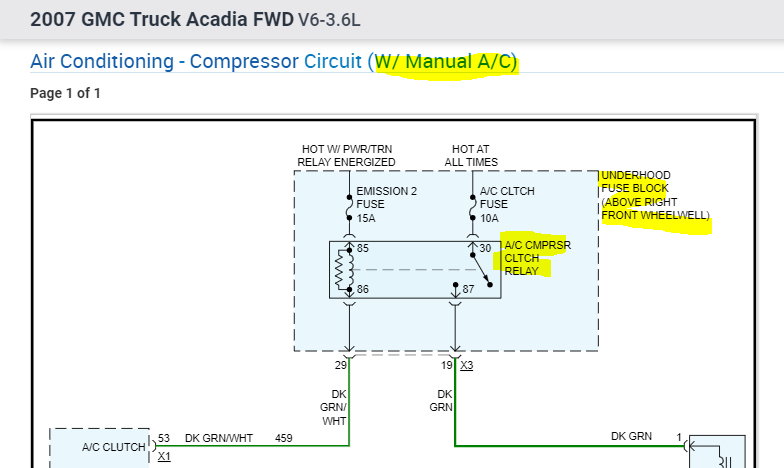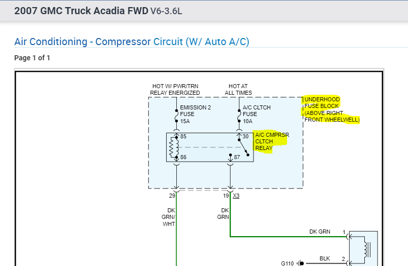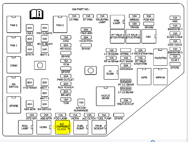 When this happens, I need you to check to see if the compressor clutch is getting power. If it is, suspect a problem with the clutch coil. If there is no power, then we need to check the clutch relay in the under-hood fuse box.