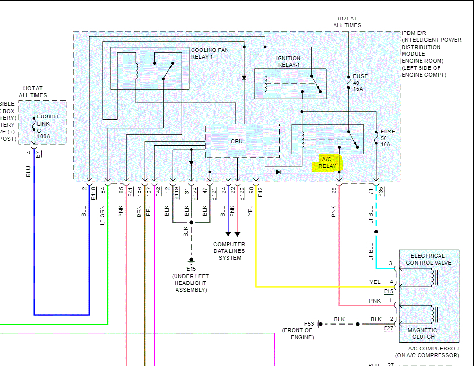 The A/C compressor relay is in the IPDM (intelligent power distribution module) under the hood. Here is the issue. You won't see it. It is an integral component within the module.