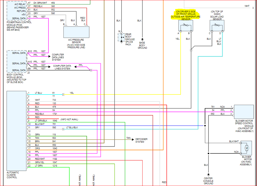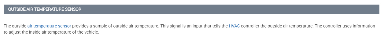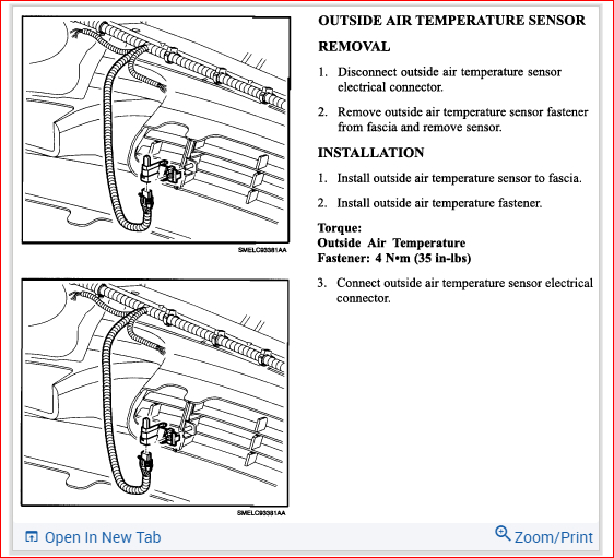 The A/C is not working, I think it's the climate control sensor for exterior. The digital readout says OC the blowers are working and when I get something different on screen it is negative 40 so blows hot air. I need an illustration of where sensor is located.