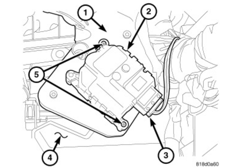 4. Remove the two screws (5) that secure the blend door actuator to the actuator mounting bracket (1) and remove the actuator.