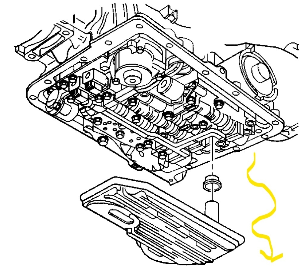 Now fill the transmission with enough Dexron 3 fluid that it shows on the stick. Start the engine, shift through all the gears and let the trans run in each for a couple seconds. Shut the engine off. Remove the pan again and drain out that fluid. Now you can put the pan back on and torque the bolts down and fill the transmission fully. It should have removed 90 percent of the bad fluid from the transmission and converter. Just pay attention to any changes like slippage or strange smells. The second part of this covers the pan and filter style similar to yours.