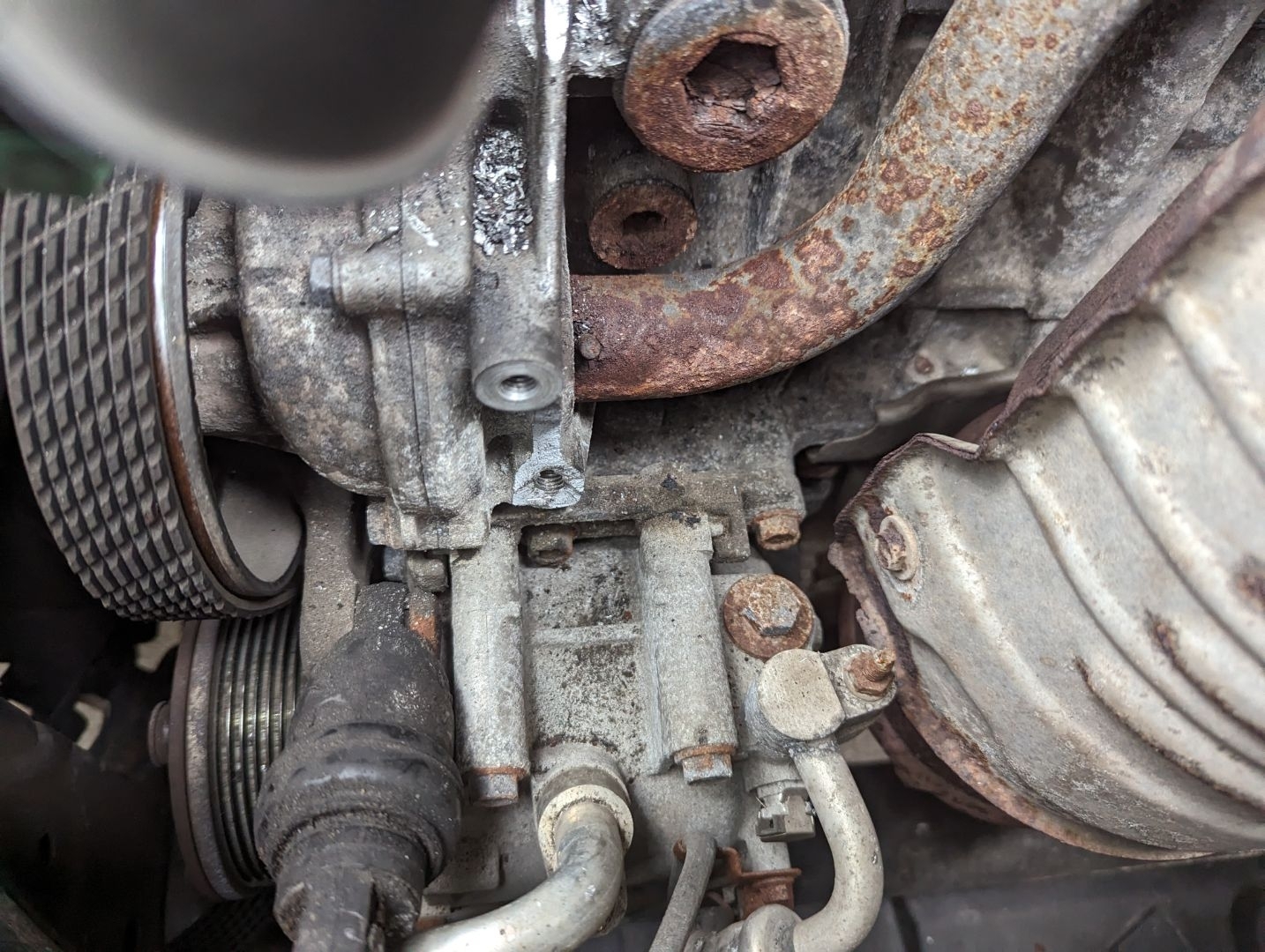 After removing the wrong bolt for the bracket and prying, it took a small chuck out the bottom hole where the bracket mounts.