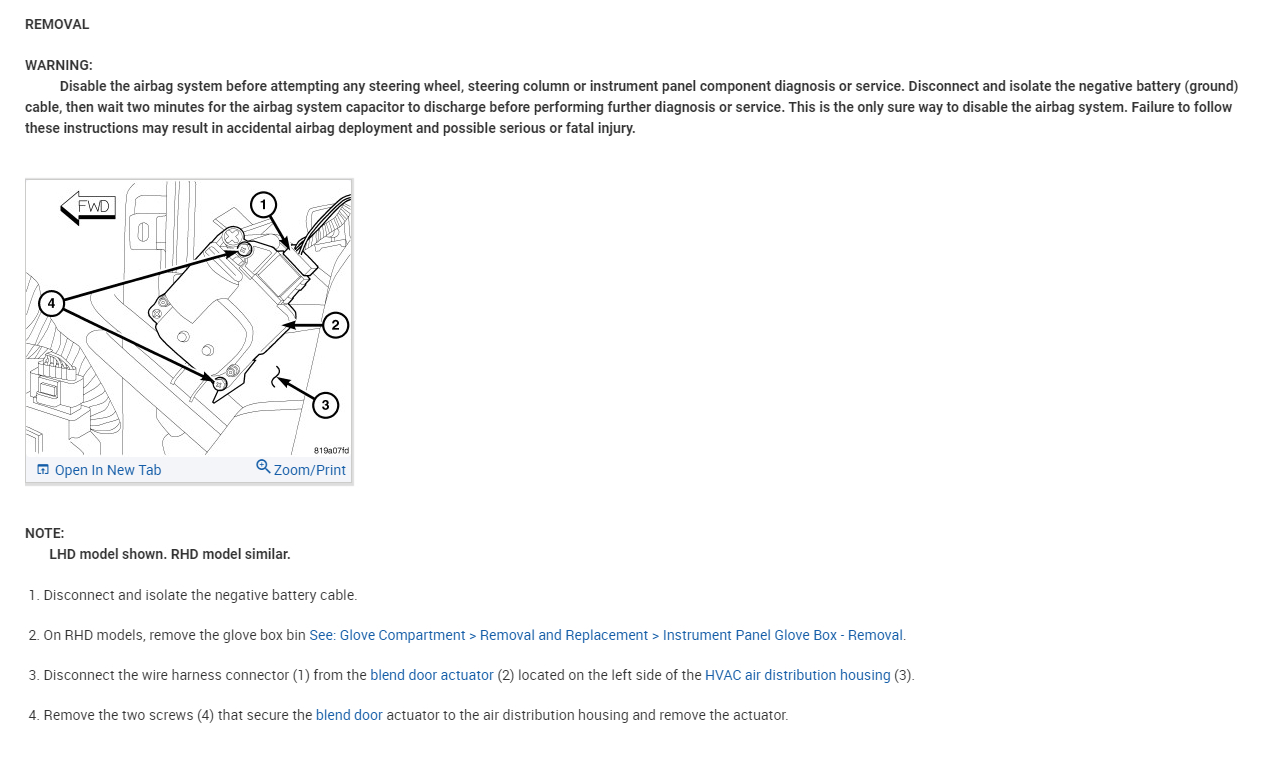I attached the procedure and location of the blend door actuator. When you get the clicking when changing temperature, it is the blend door actuator. It is behind the glove box.