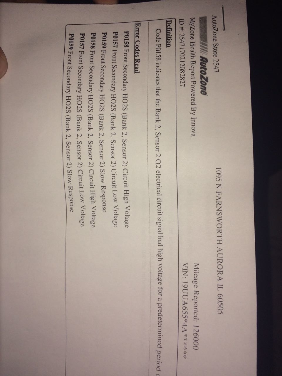 AutoZone gave a report which defined the P0158 code. It says that the Bank 2, Sensor 2 O2 electrical circuit signal had high voltage for a predetermined period of time. The error codes read are P0158, P0157 and P0159.