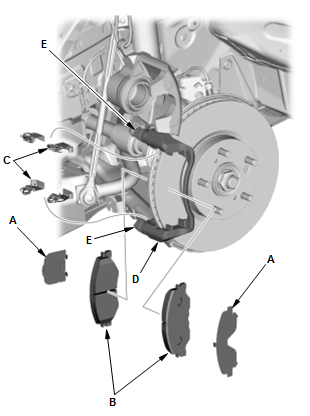 Verify that the caliper pins (E) move in and out smoothly. Clean and lube if needed.
