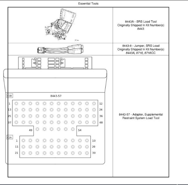 When powered, the Occupant Restraint Controller (ORC) sends a test current to the squibs to verify the integrity of the squib and wiring. These circuits are maintained in a "floating" configuration at the ORC (connected to neither power nor ground) as protection against inadvertent deployment. Use of the Supplemental Restraints System (SRS) Load Tool Kit (8443A) in the tests below substitutes a suspect squib with a known good component. The use of the SRS Load Tool Adapter provides a test point as well as a method for opening the shorting bar connections within the ORC harness connector.