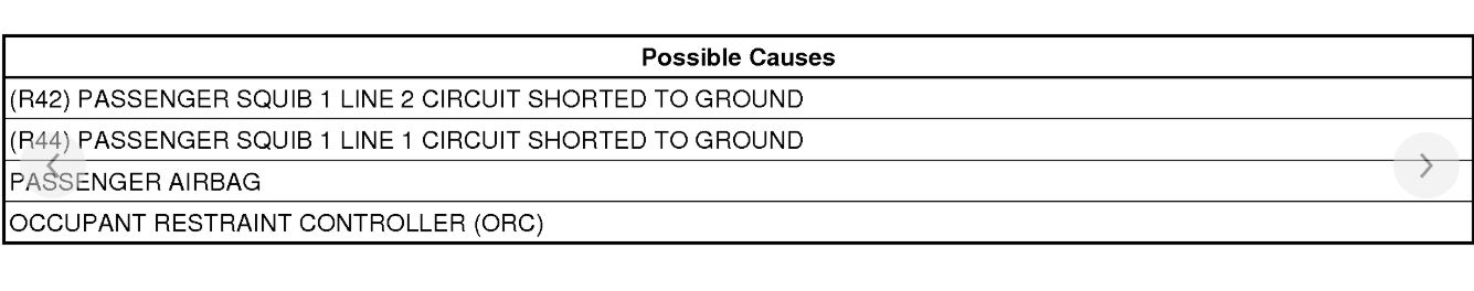 This Diagnostic Trouble Code (DTC) sets when the ORC detects a short to ground on the squib circuit for more than 2.5 seconds. This DTC transitions from active to stored when the ORC sees a recovery from a short to ground condition for greater than 2.5 seconds.