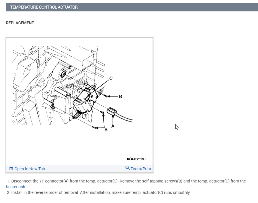 If you find the air door actuator (blend air door) is not working, here are the directions for both testing and replacement. All attached pictures correlate with these directions.